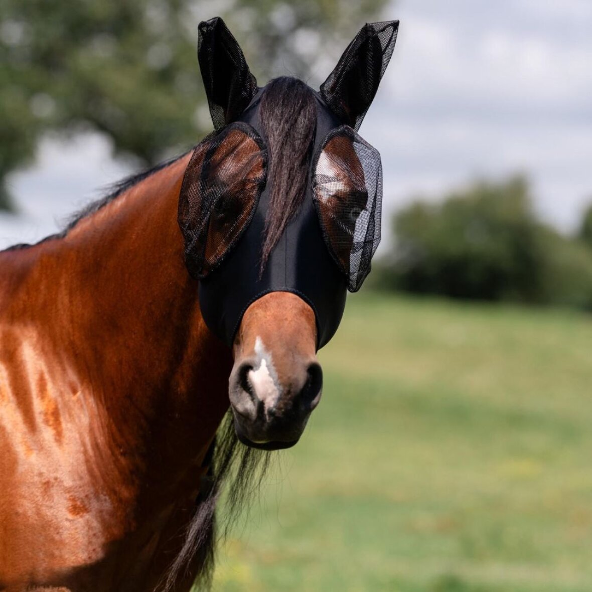 Blød, strækbar lycra fluemaske fra Professionel Choice, som passer hesten som en handske, med hul til pandelokken, mesh er påsat omkring øjnene og ørerne til beskyttelse mod fluer. Den trækkes nemt ned over hoved på hesten.
