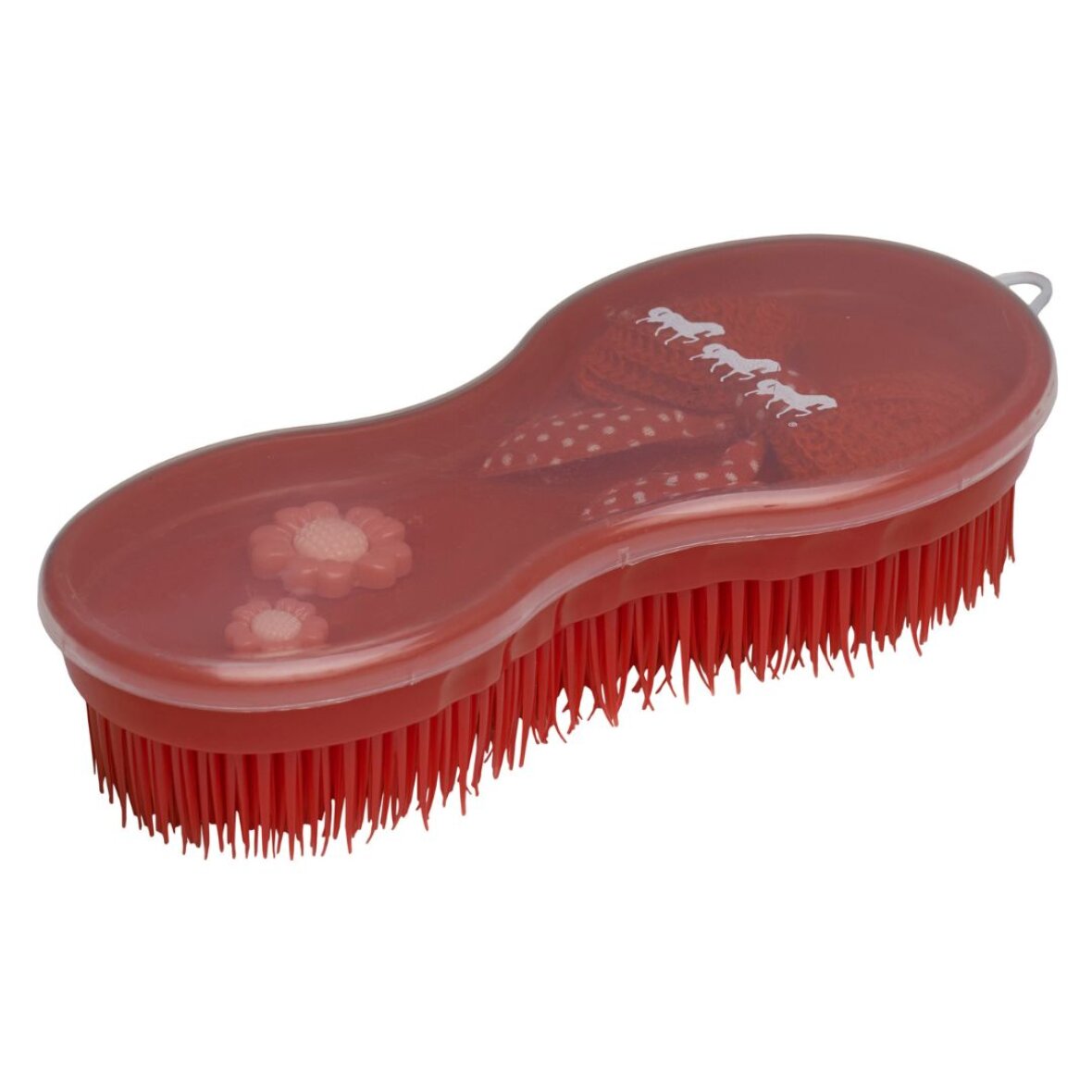 Sød multistrigle i rød med sløjfe og blomster. Striglen er genial til at få tørrede mudder af benende. Den er ideelle til rengøring af mug og mellemrum mellem hove og sko, men samtidig blid på de følsomme områder af kroppen. Fjerner effektivt snavs, mudder og græspletter fra benene, samtidig med at de er bløde på led og ben. Nyttig til alle typer hestehår og fjerner nemt tørret sved fra kroppen, også ideel ved vask af hesten. Fjerner hesthår nemt fra underlag og tæpper så de kan vaskes af maskinen.