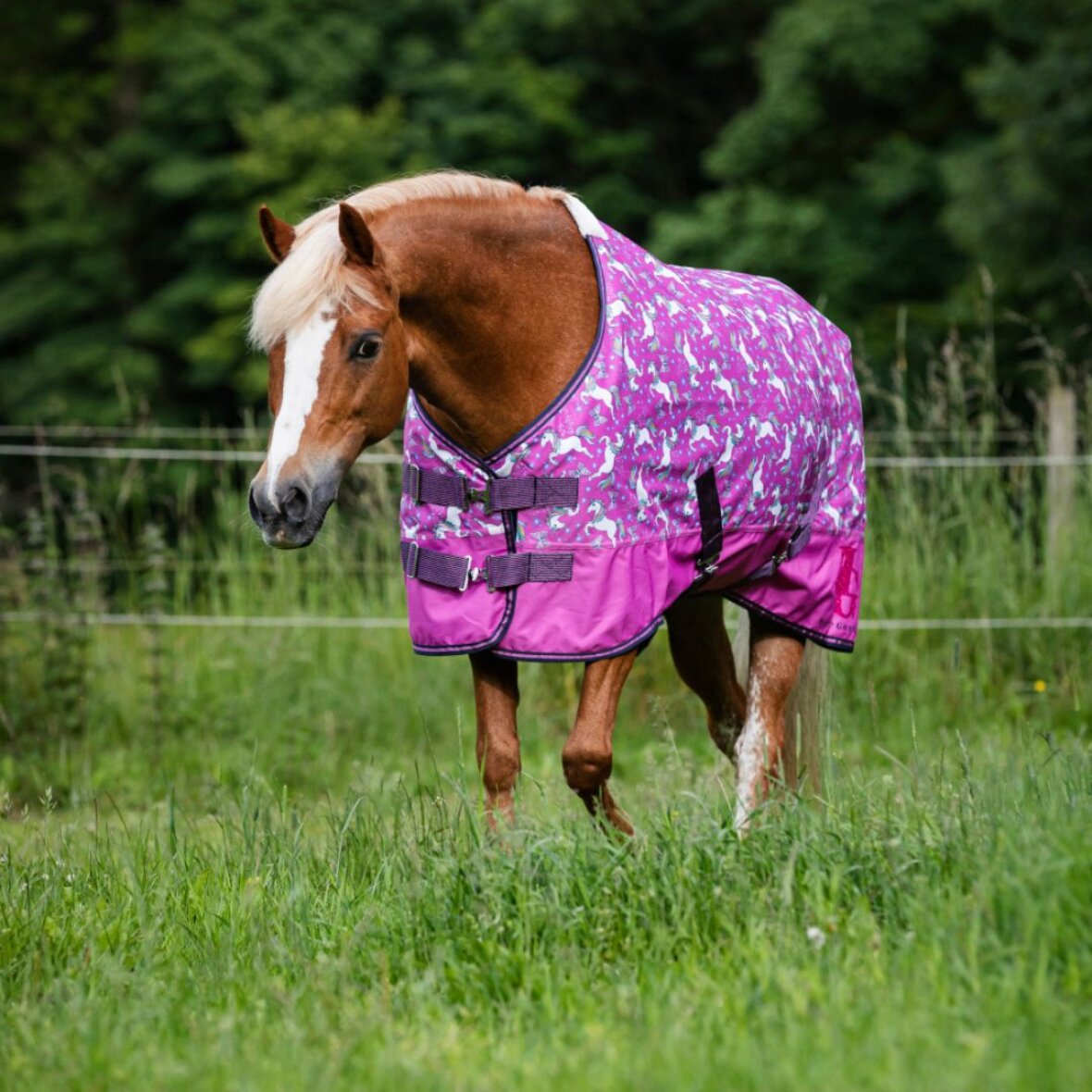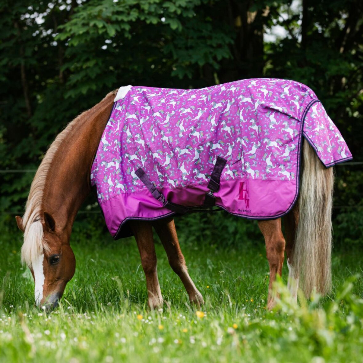Sødeste regndækken fra HorseGuard med 0 g fyld. Dækkenet er fremstillet i 600D yderstof og med et vandsøjletryk på 5000mm. Dækkenet er med unicorn motiv og er med justerbare mavestropper, bagbenstropper og haleflap.