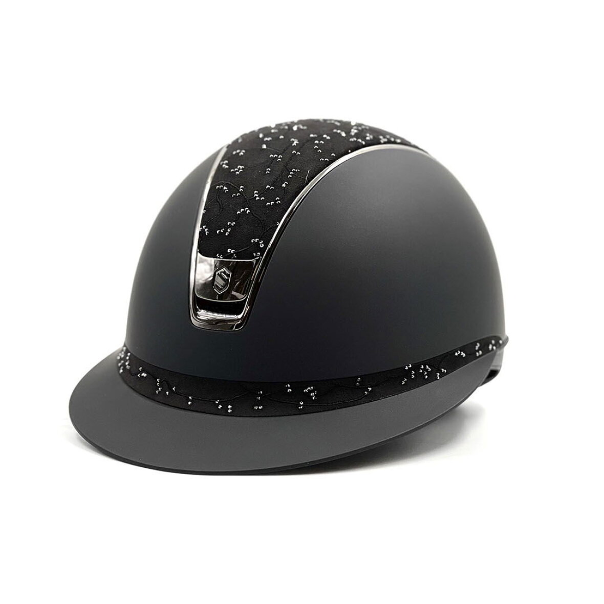 Smuk custommade Miss Shield 2.0 samshield ridehjelm i sort shadowmatt med crystal leaf top og frontal bånd, trimmen er black crome. Miss Shield 2.0 ridehjelmen har en mere oval pasform som gør at den kommer længere ned på hoved og om nakken. Miss Shield 2.0 har også fået et opgraderet luftindtag foran, som giver enestående ventilation, samt ridehjelmen har ingen direkte tryk på panden, så man undgår sved og hovedpine.