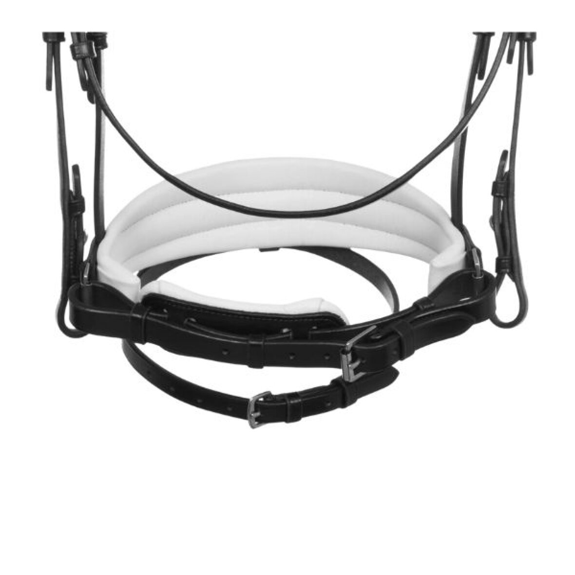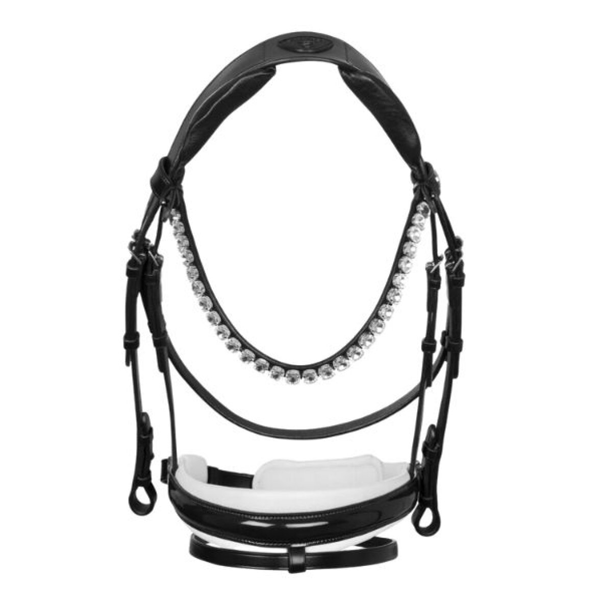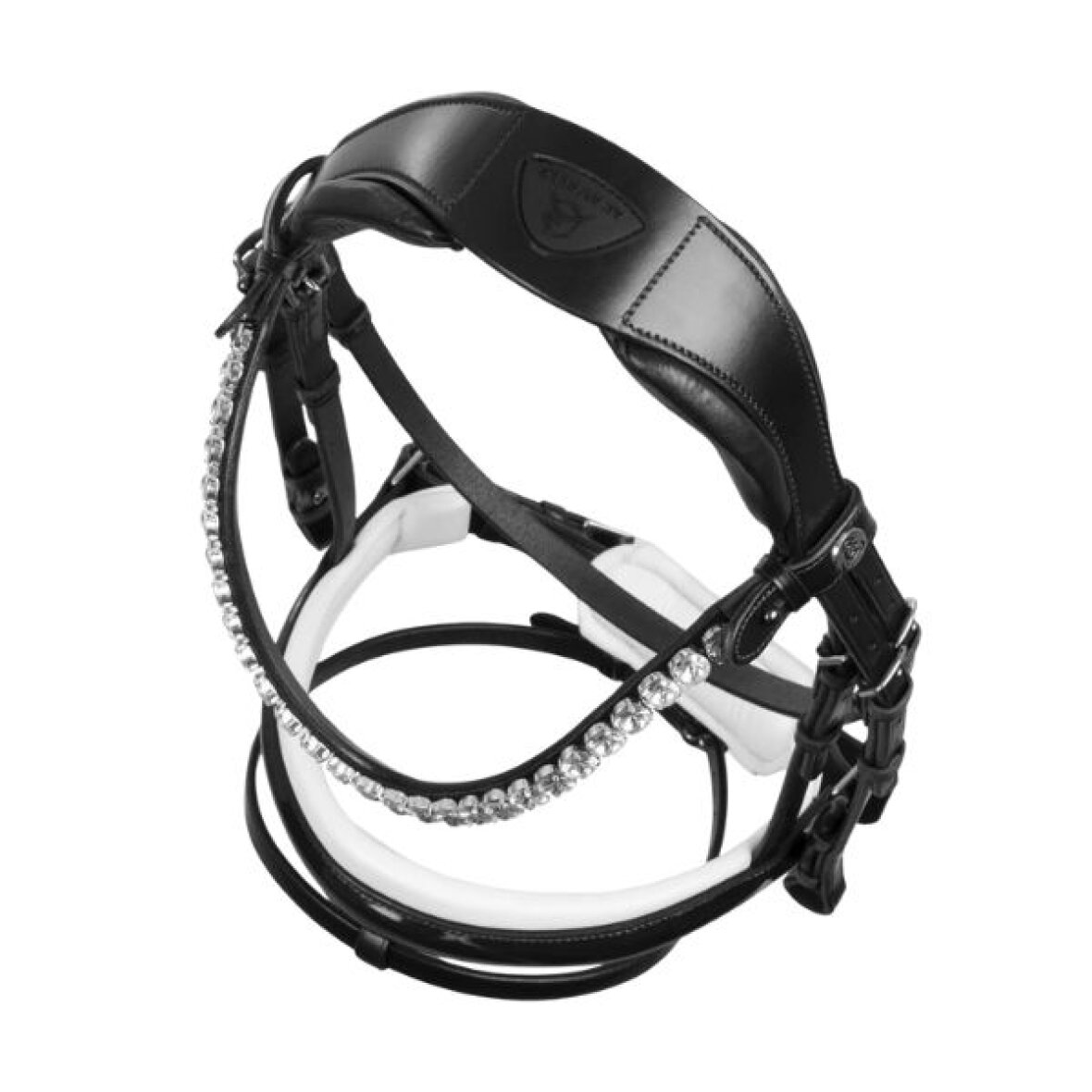 Smuk trense fra Acavallo med hvid foring og lak ved næsestykket samt pandebånd med sten og lak. Trensen er lavet af det fineste italiensk kalveskind med et formet anatomisk nakkestykke, hvilket er designet til at reducere trykket på hestens kranium. Dette sikrer overlegen komfort uden at forstyrre hestens ører. De robuste og rustfrie spænder sikrer holdbarhed og en sikker lukning.