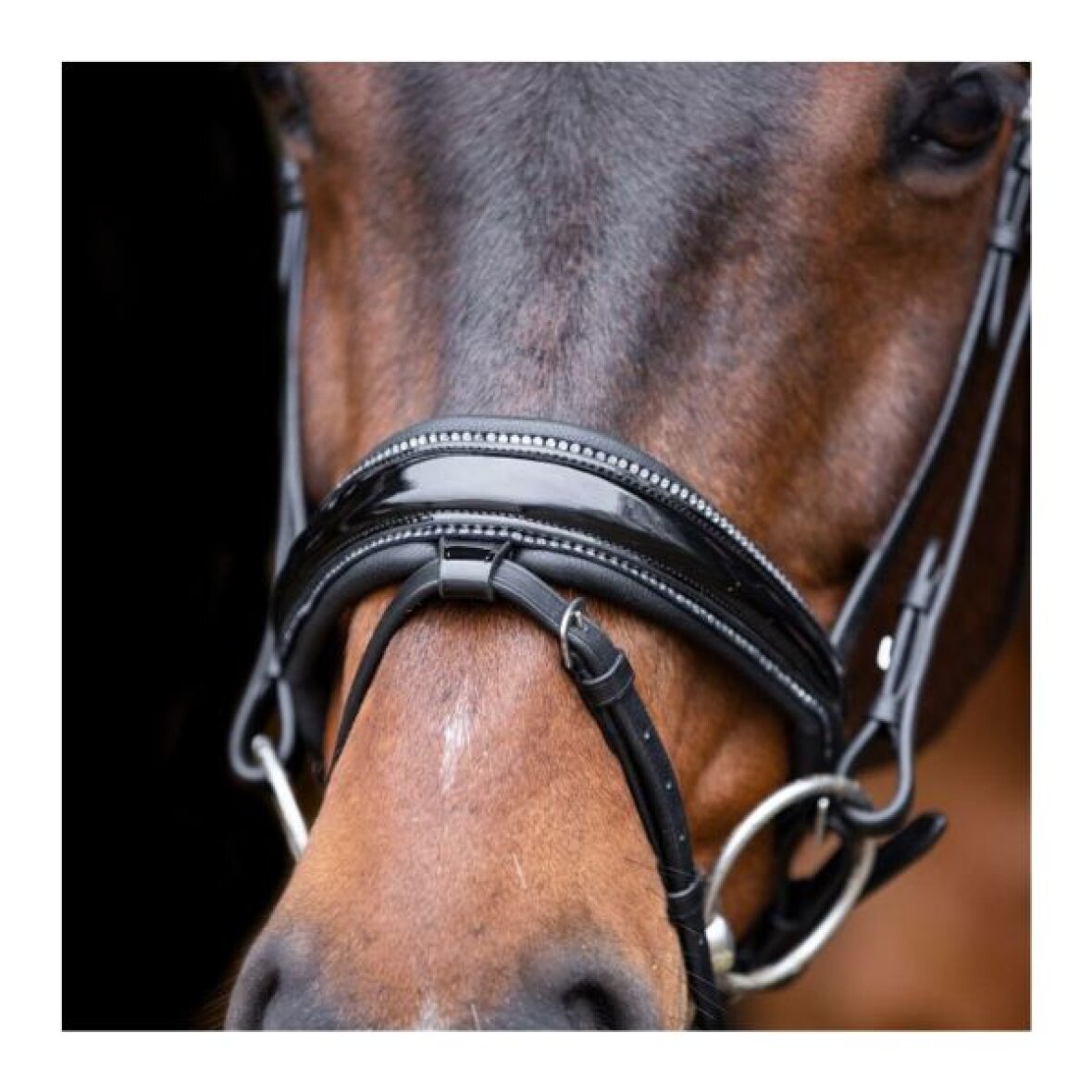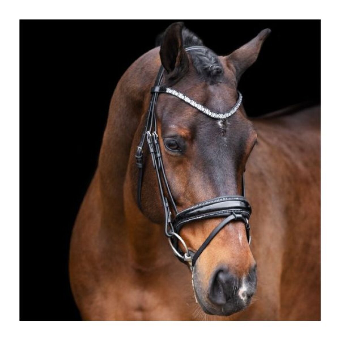 Smuk trense fra Imperial Riding med lak og krystalsten på næsebåndet samt pandebånd med krystalsten. Trensen er lavet i buffalo læder og polstring i kalvelæder samt spænder i rustfrit stål.