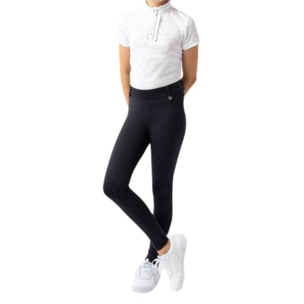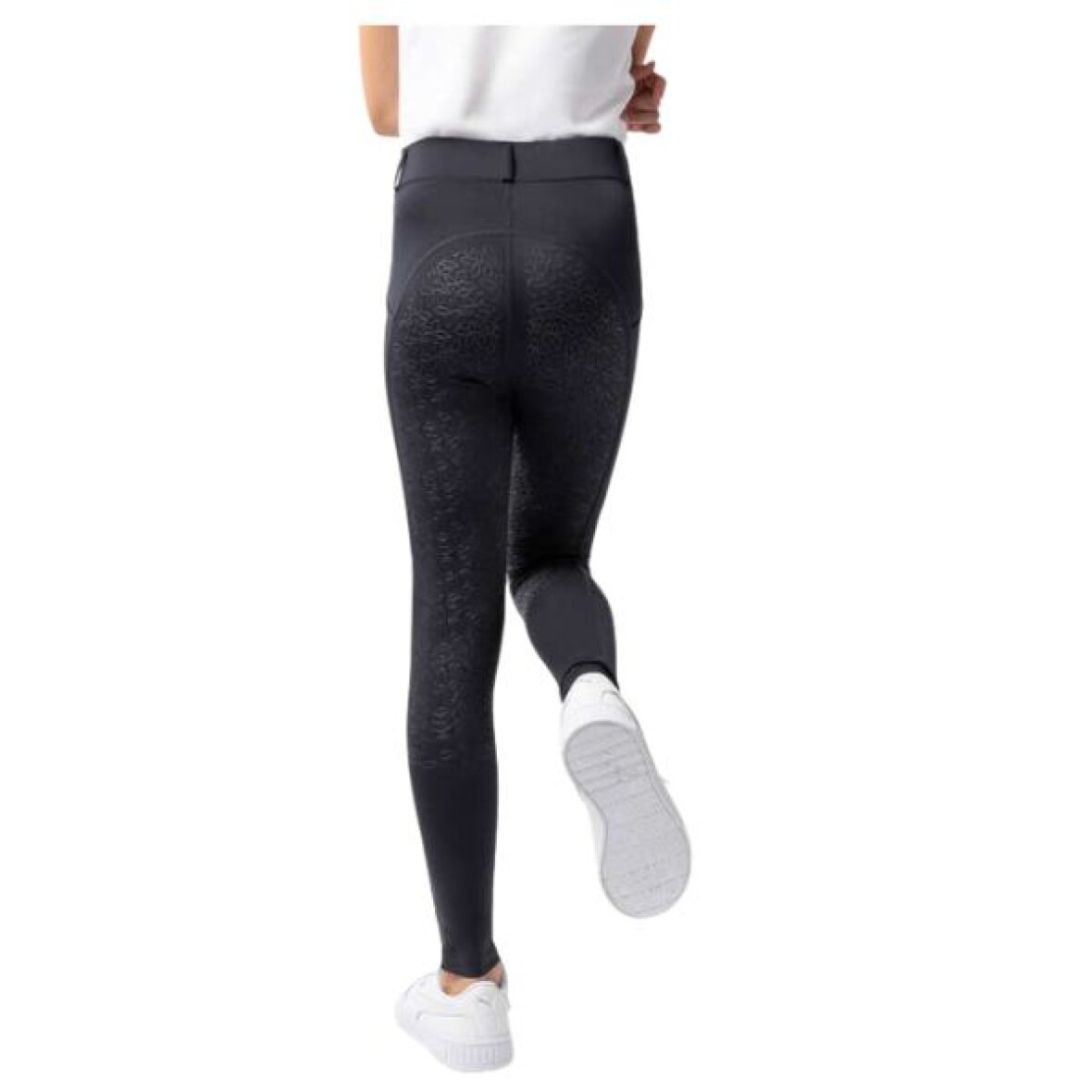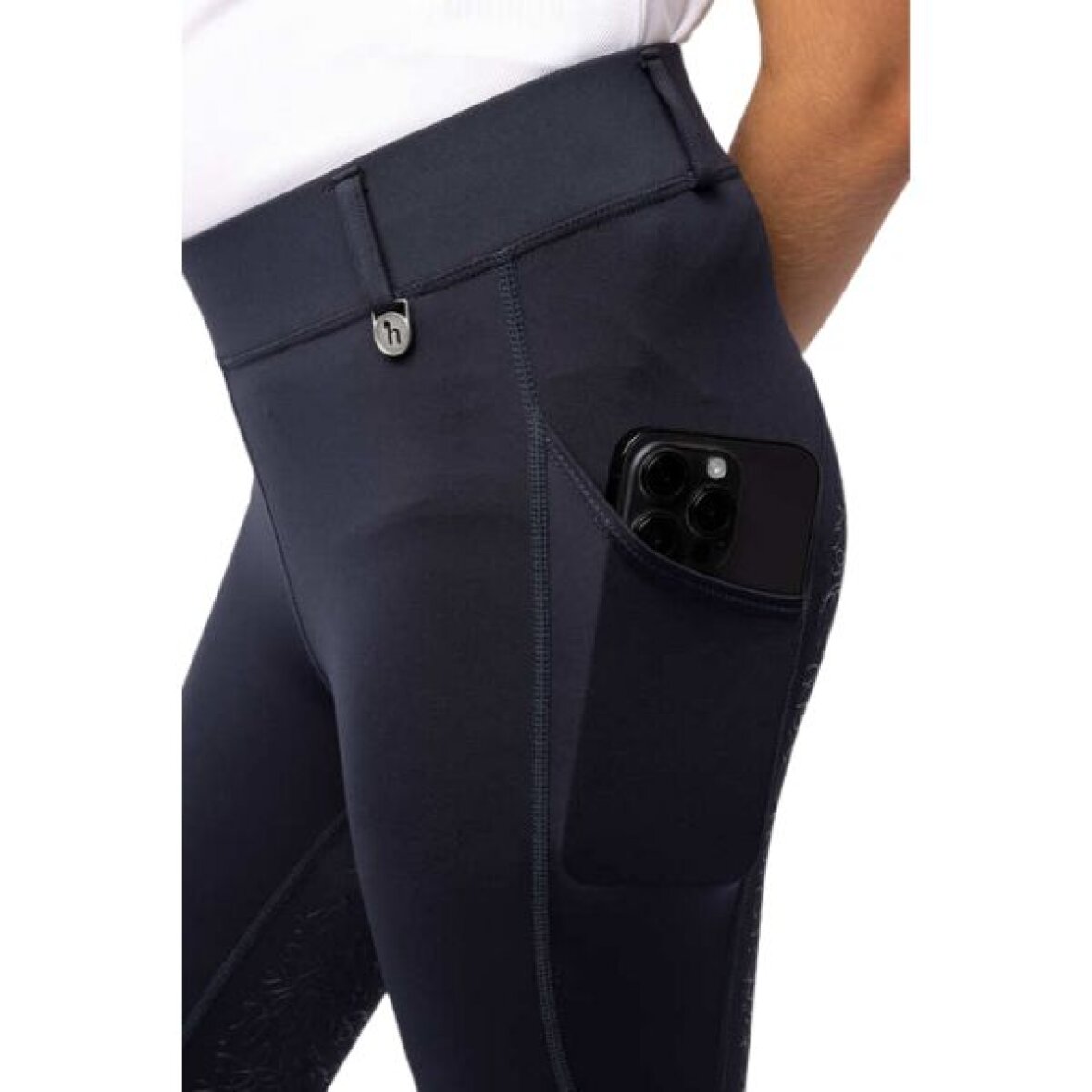 Strækbare børne ridetights fra Horze. Disse ridetights er med fuld silikone grip med mønster, telefonlommer på begge sider. De er med bred elastik linning og bæltestropper. Ridetights'ene er fremstillet i åndbart materiale og har et lille Horze logo patch ved hoften.