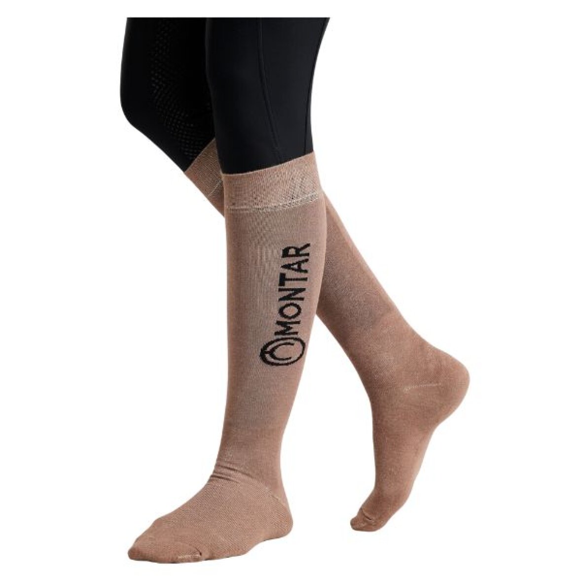 Knæhøje ridestrømper fra Montar. De er fremstillet i bambusviscose og er derfor bløde, åndbare og meget behagelige at have på. Montar logo på siden.