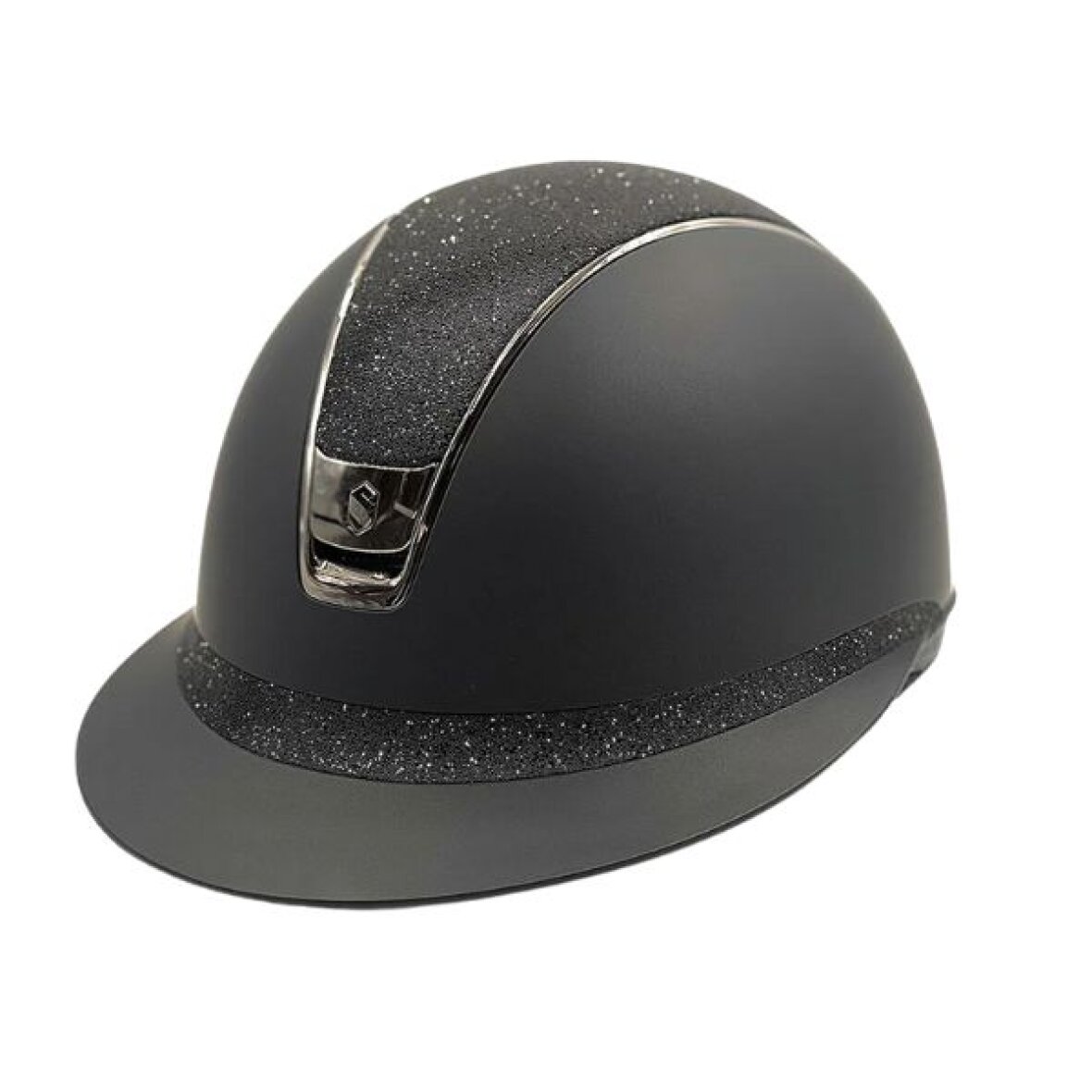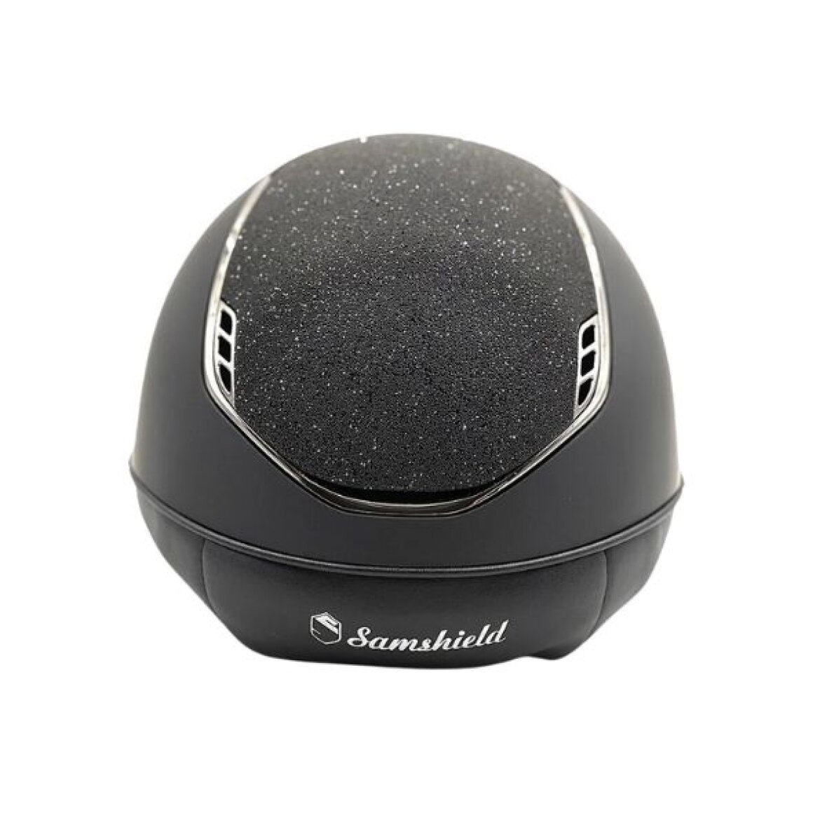 Smuk custommade Miss Shield 2.0 samshield ridehjelm i sort shadowmatt med crystal fabric top og frontal bånd, hvilket betyder at den er prydret med 300 swarovski krystaller. Trimmen er black chrome.