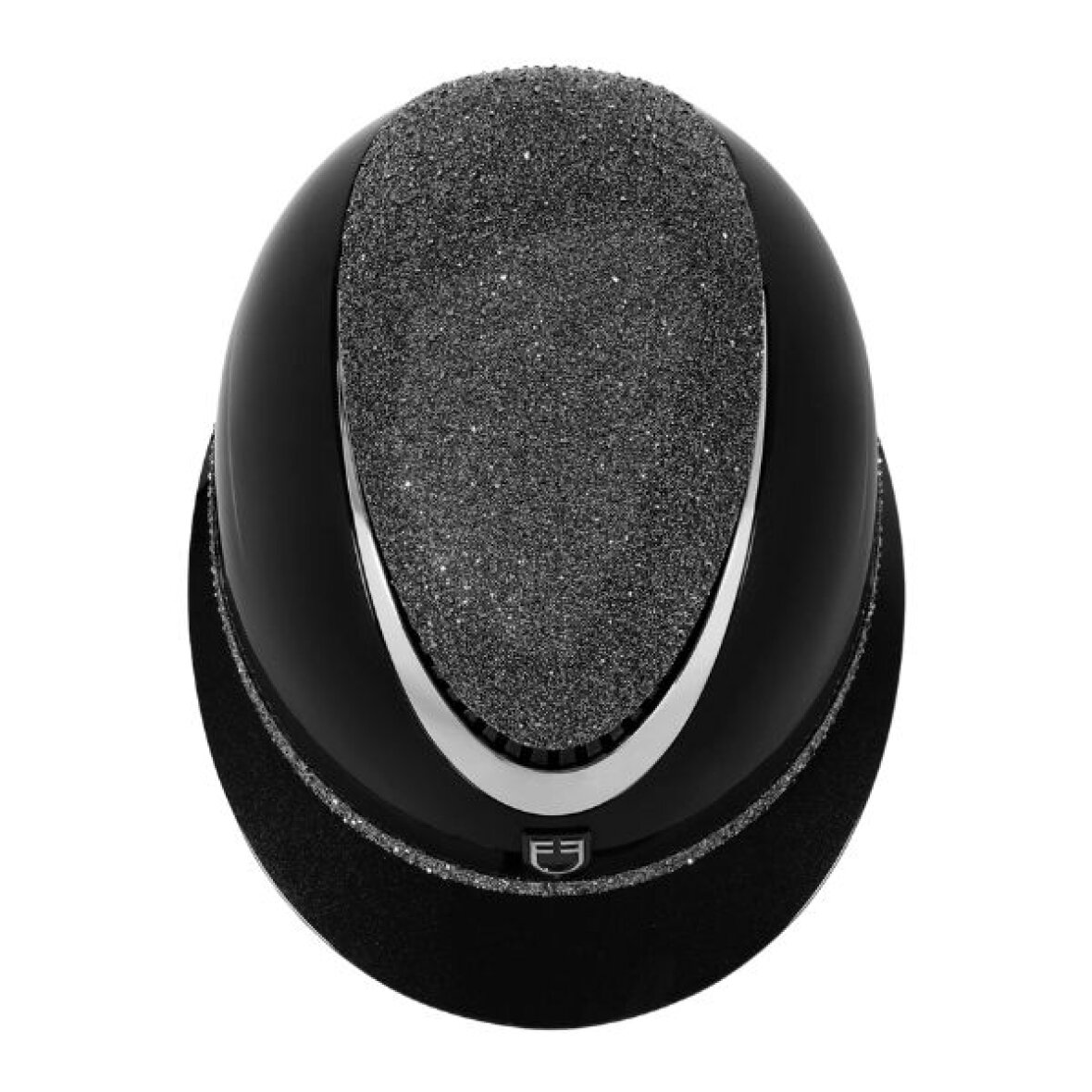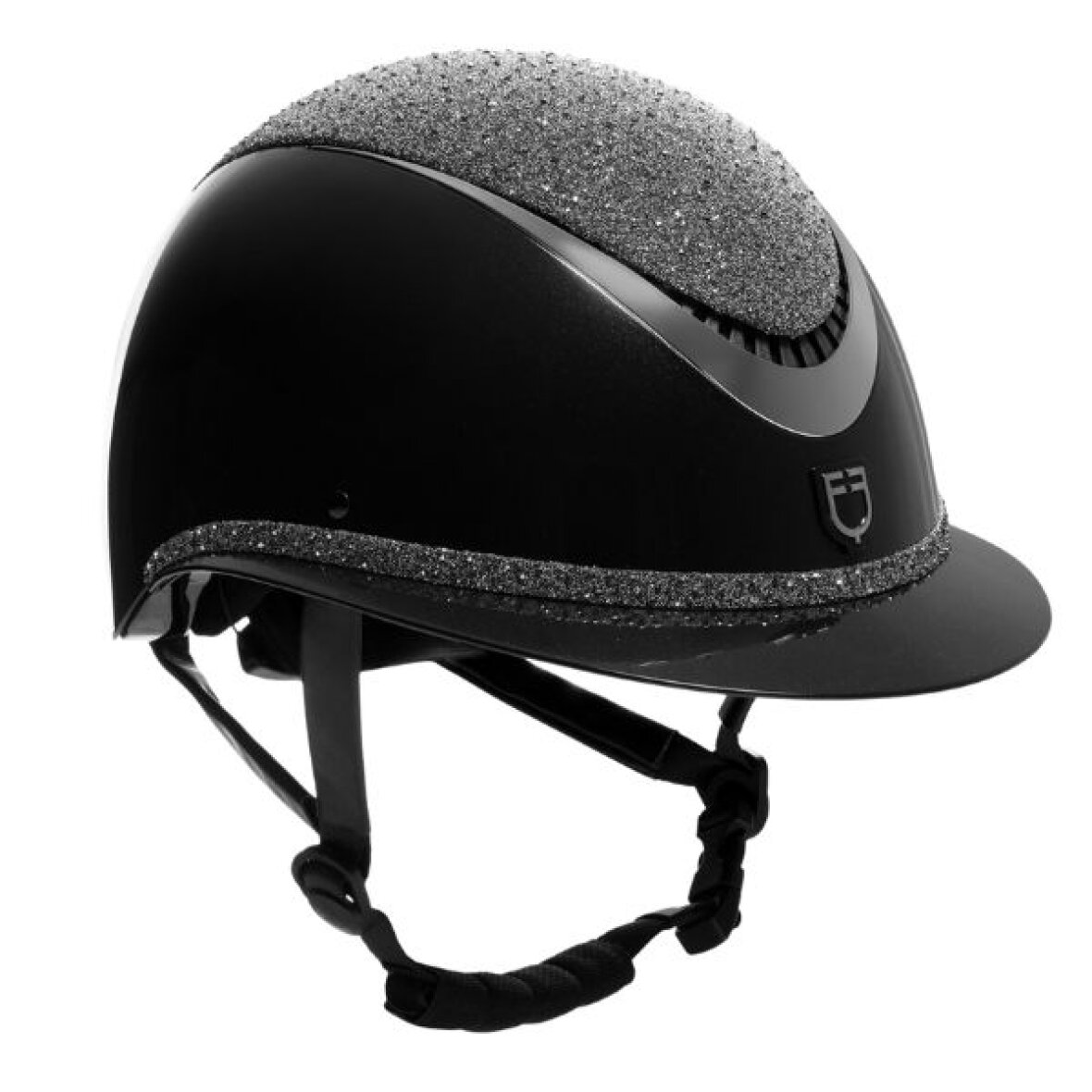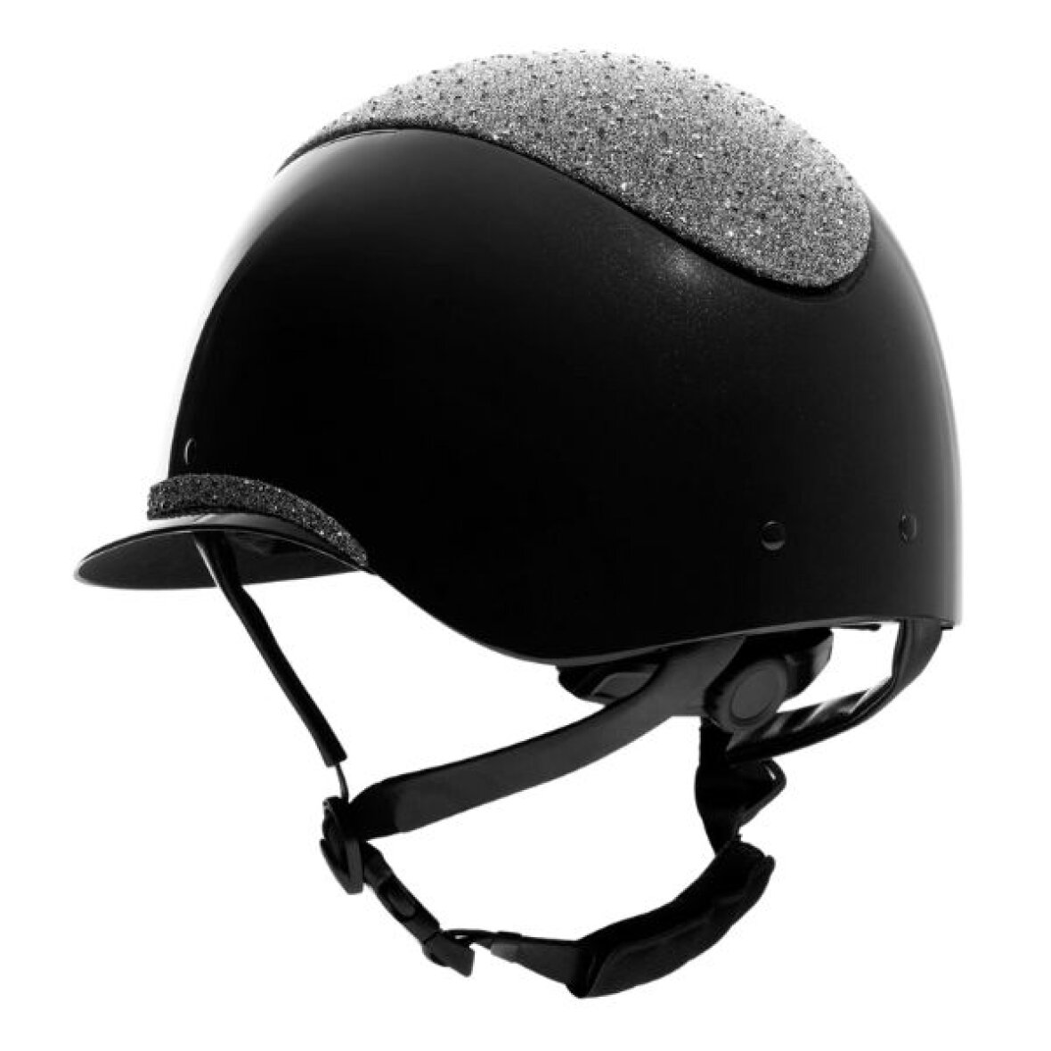 Elegant, letvægts ridehjelm fra Equestro med bred skygge. Denne ridehjelm er glossy med rhinsten på top og på frontbånd samt Equestro-logo i fronten. Åndbar liner indvendig og ventilationshuller. Justeres i størrelsen i nakken og ved hagestopper.