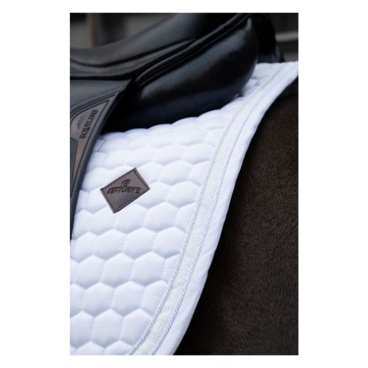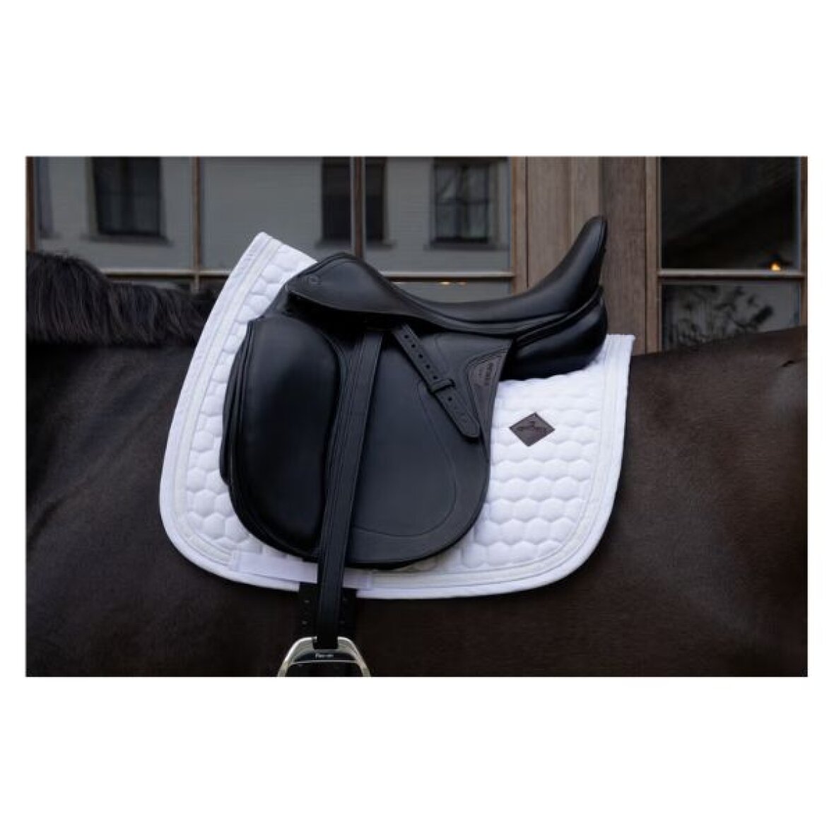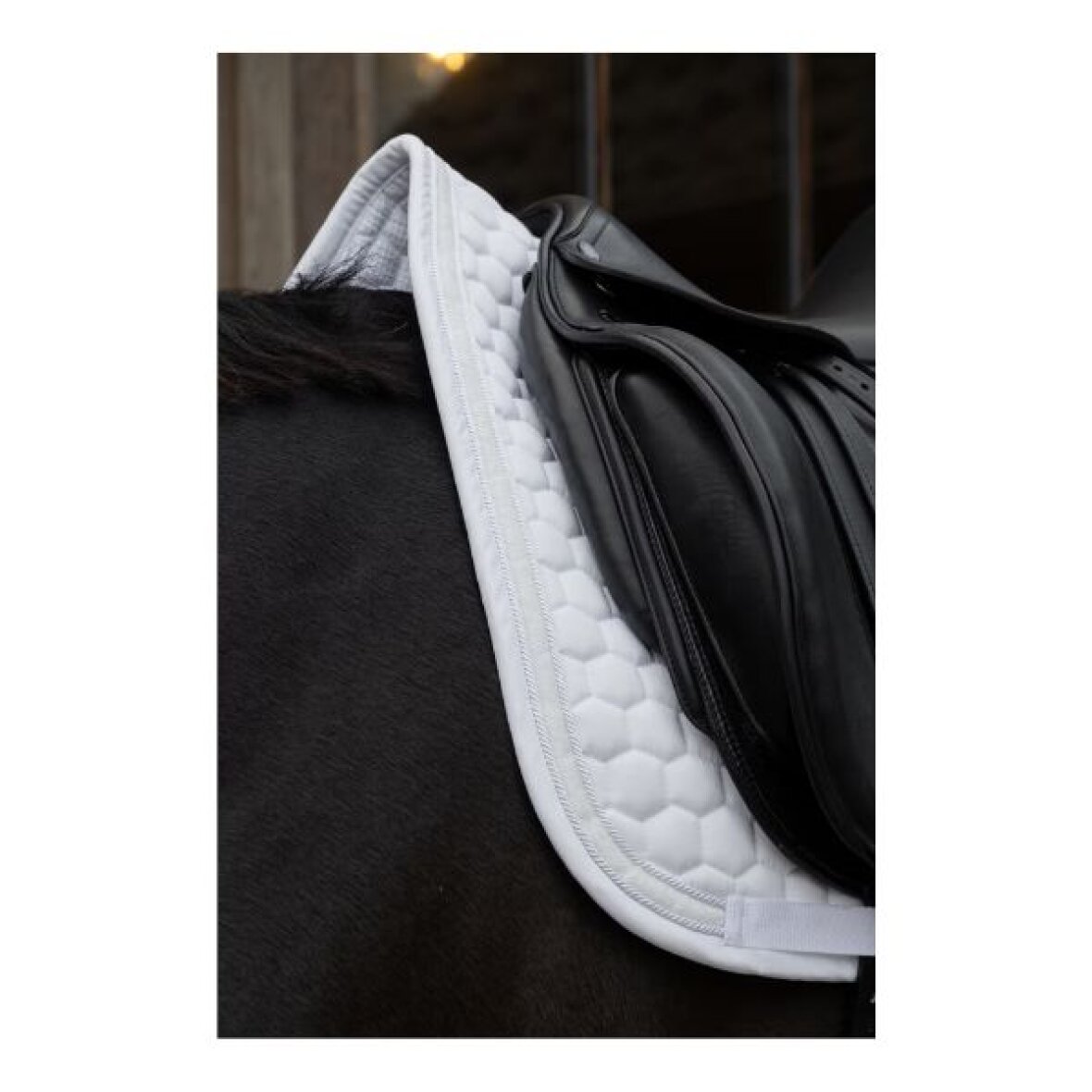 Dressurunderlag fra Kentucky Horsewear med eksklusive flettede pipes og glitterpipe. Dette sadelunderlag er fremstillet af et hurtigttørrende bomulds-polyester-blandingsstof med mønster, der sikrer, at din hest forbliver komfortabel, selv under intense træningssessioner. Den indre polstring er åndbar og giver effektiv stødabsorbering mellem sadlen og din hests ryg. Det syede Kentucky-logo, lavet af førsteklasses vegansk læder, fremviser Kentucky-kvalitet på afstand. Underlaget er anatomisk formet så det er designet til at passe perfekt til din hests ryg og afhjælper tryk på manken og sikrer, at den ikke glider, trykker eller gnider.