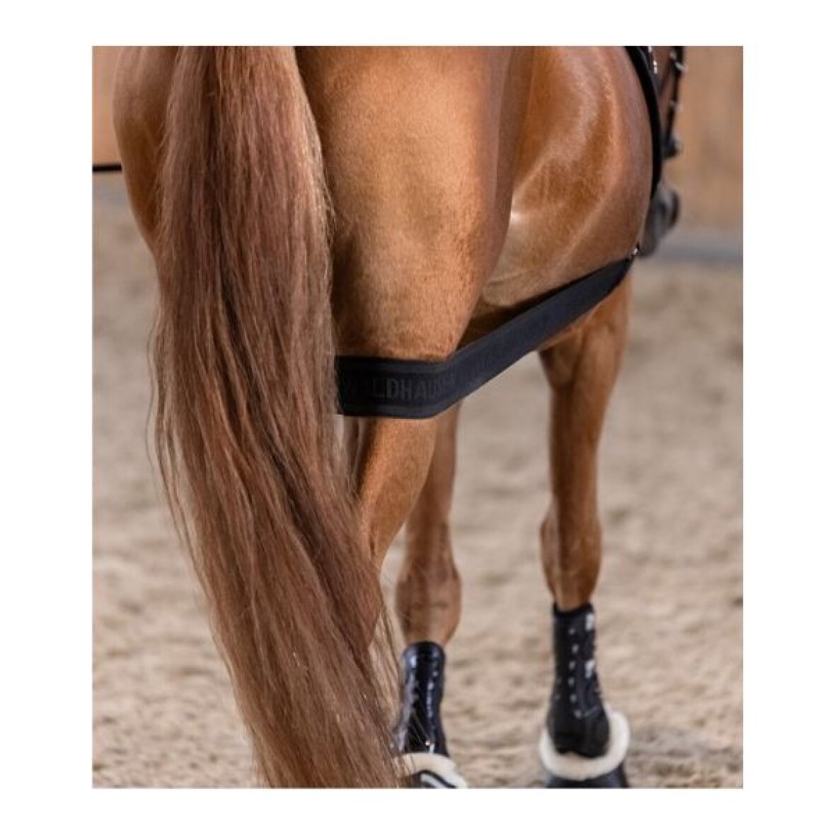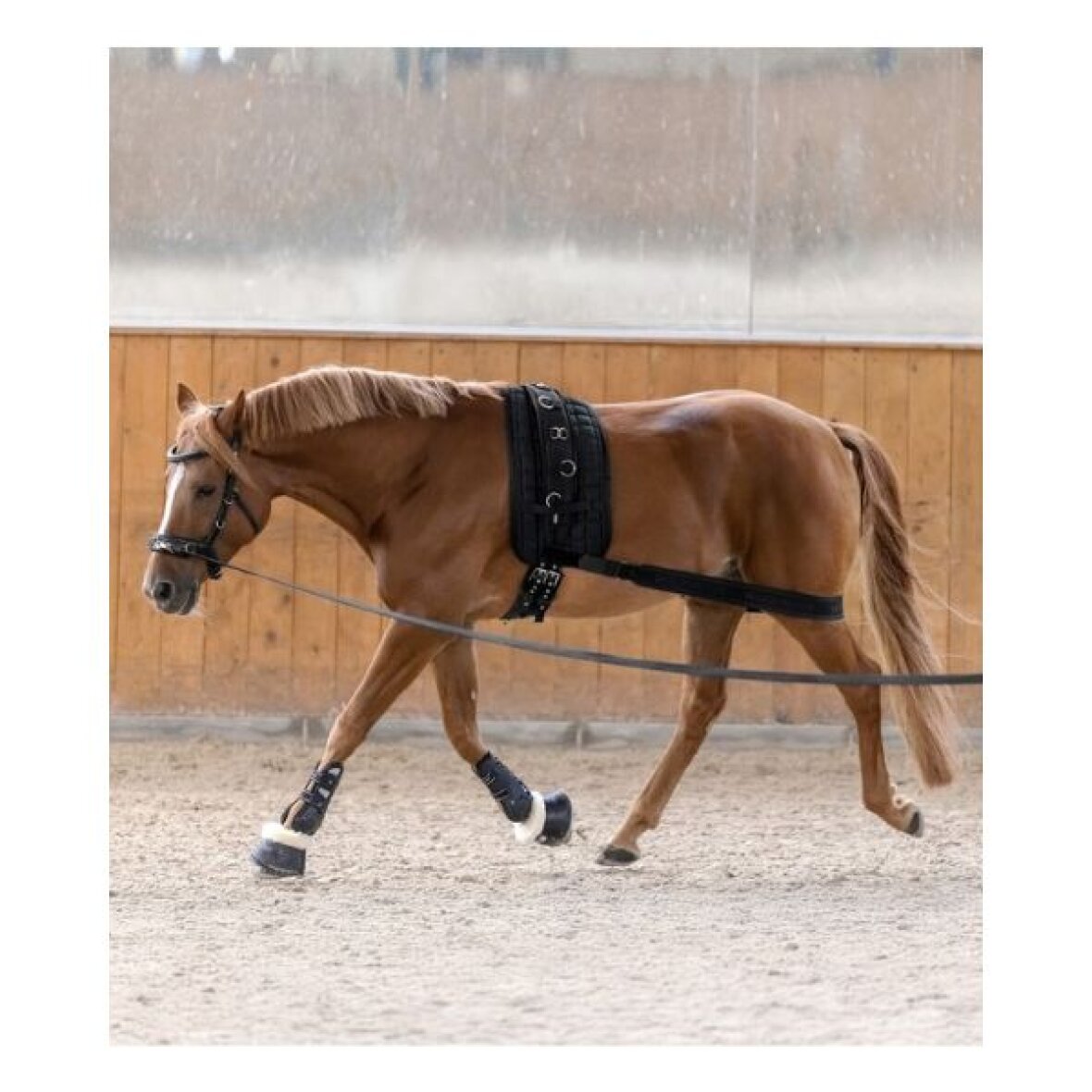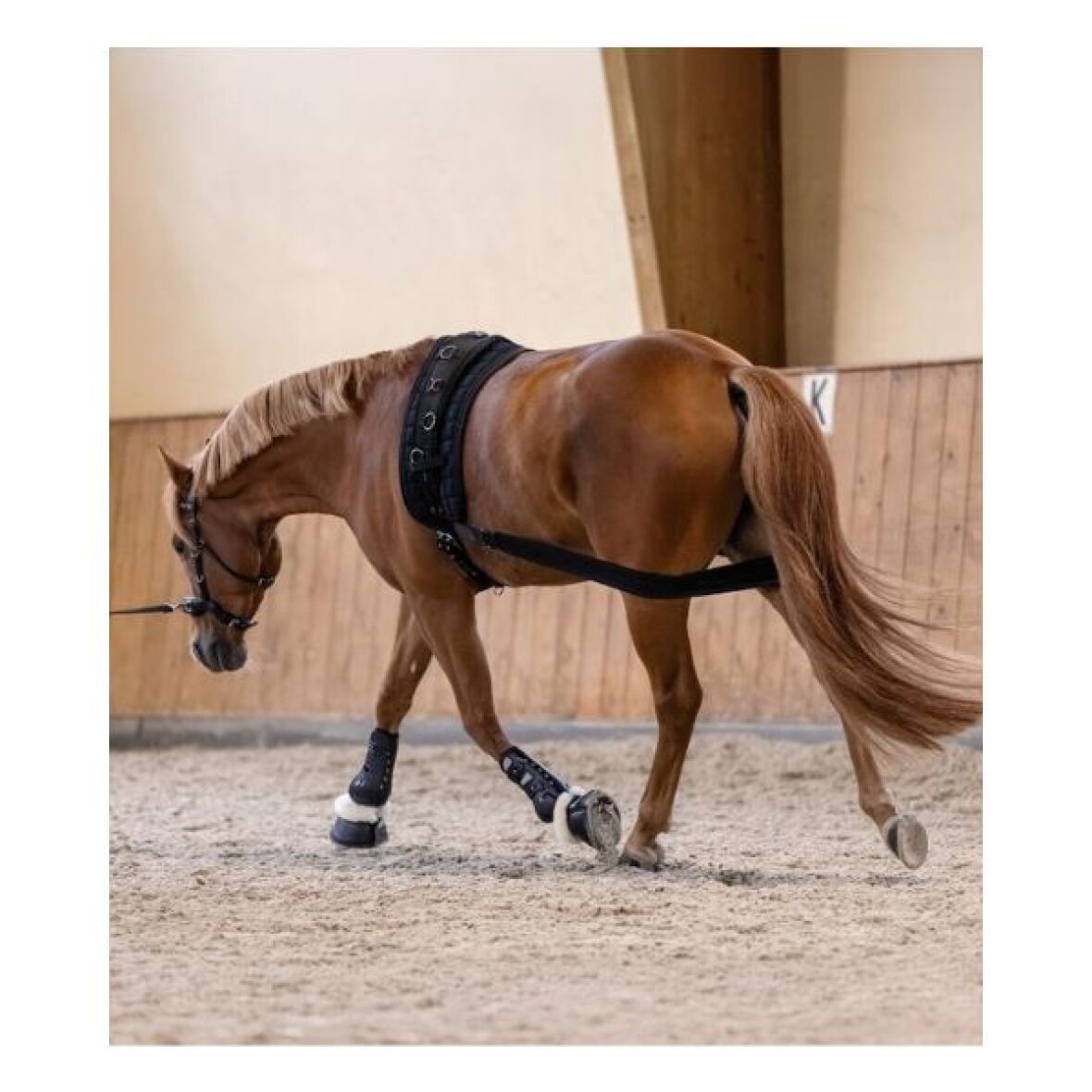 Body bandage fra Waldhausen. Et hjælpemiddel der er udviklet til at aktivere hestens bagpart. Den målrettede støtte forbedrer hestens evne til at skubbe fra under tyngdepunktet, hvilket er en stor fordel både under ridning og longering. Støttens meget elastiske materiale sikrer en optimal pasform og gør den nem at bruge. Takket være velcrolukningen på begge sider kan bandagen hurtigt og nemt fastgøres til både longeringsgjorden og sadelgjorden og justeres i længden, så den kan tilpasses individuelt til din hest. Kan bruges under ridning eller longering.