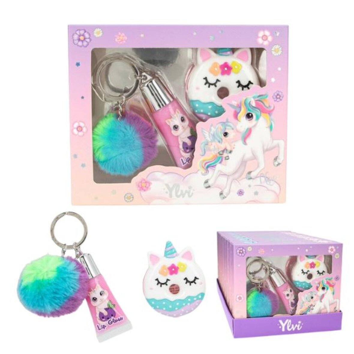 Lipgloss sæt fra Ylvi og består af en blåbærduftende lipgloss i tube (8 ml), en regnbuefarvet pom-pom nøglering og en lipgloss med sød æbleduft (2 g) i form af en enhjørning donut. Sættet er pakket i den fineste gaveæske og er perfekt som gave.