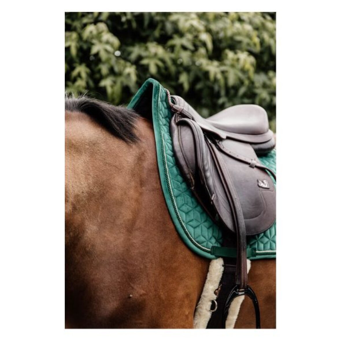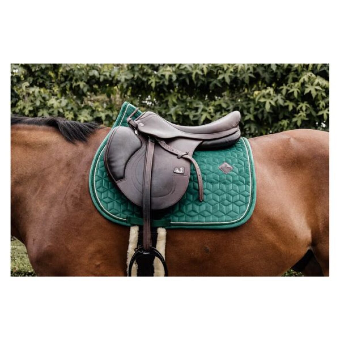 Stilfuldt spring underlag fra Kentucky Horsewear med velour stof og dobbelt snoet kantbånd. Diskret logo i kunstlæder, der er placeret lidt højere på underlaget, så der er plads til dit eget broderi, hvis det ønskes. Der er en fremragende polstring mellem hestens ryg og sadlen, samtidig med at det beskytter mod friktion. Underlaget har ingen irriterende stropper til at fastgøre til sadlen, kun en nylonrem til gjorden.