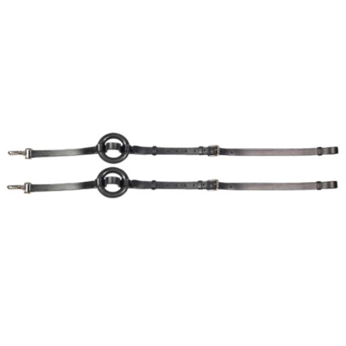 Indspændingstøjler i højkvalitets læder med gummiringe fra Horze. Denne hjælpetøjle lader rytteren lægge direkte tøjlepres som hjælper hesten med at holde en let kontakt med biddet mens den bevæger sig frit i trensen. Den er især effektiv på heste med for høj hovedposition eller en overspændt rygmuskulatur. Tøjlens glidende virkning på bidringene skaber en mere stabil kontakt. Gummiringene gør tøjlerne nemme at håndtere og justere alt efter hestens niveau. Praktiske karabinhager i enderne.