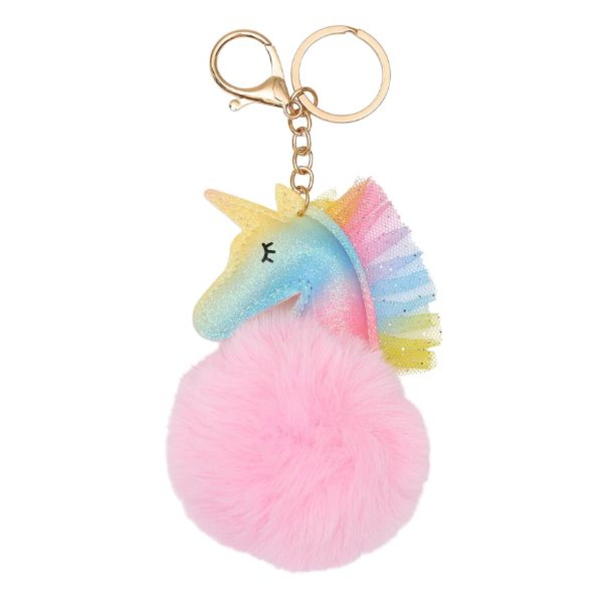 Sød pom pom nøglering fra Equipage med en regnbuefarvet enhjørning og glitter.