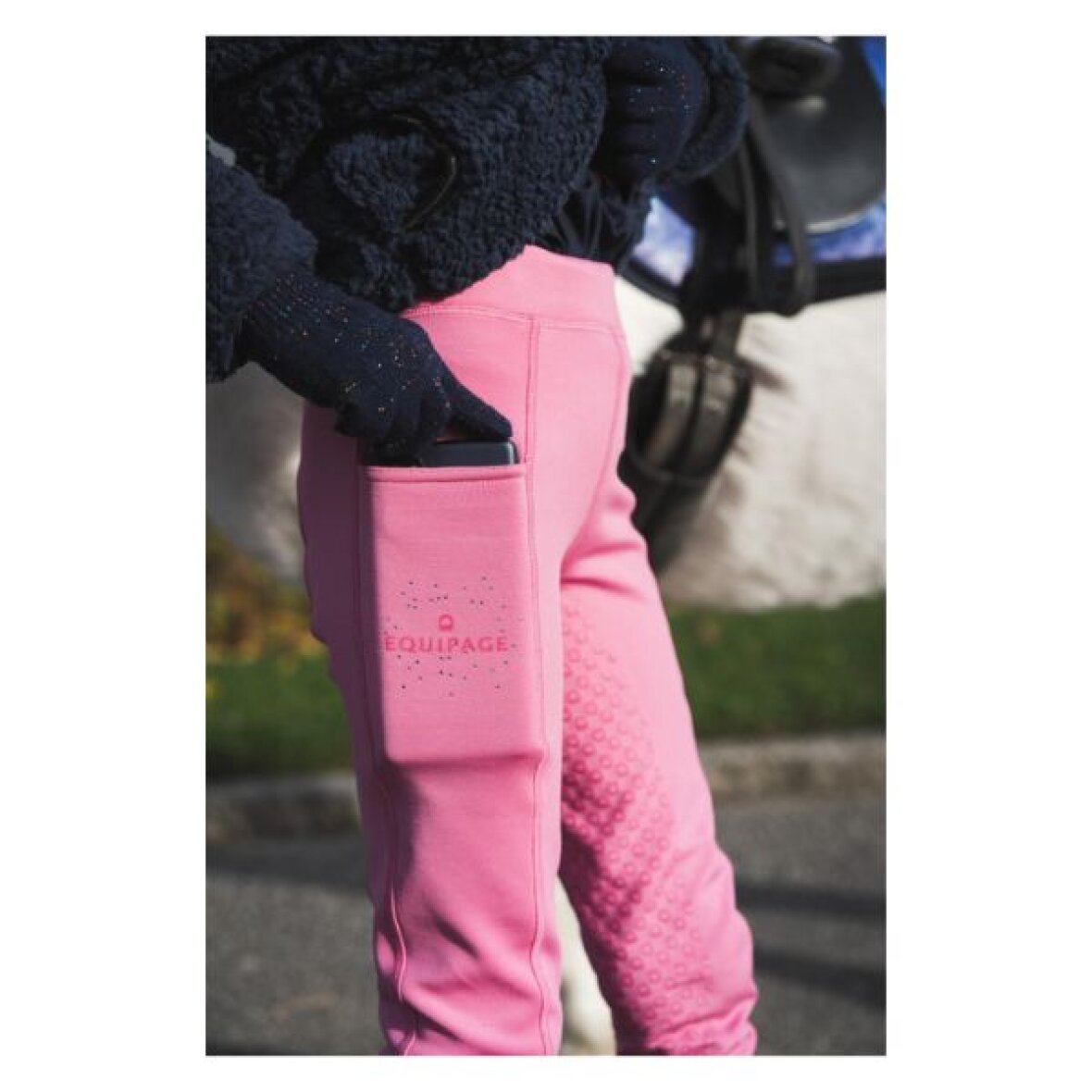 Vinter ridetights fra Equipage i en fin pink farve. Med fuldgrip af silikone i logomønster og børstet inderside. Ridetightsene har et bred taljebånd med justerbare stropper indvendigt, hvilket holder tightsene godt oppe. Praktisk mobillomme med fine sten og tone-i-tone logo på højre ben giver nem adgang til småting under ridning.