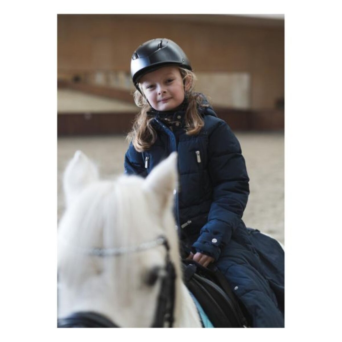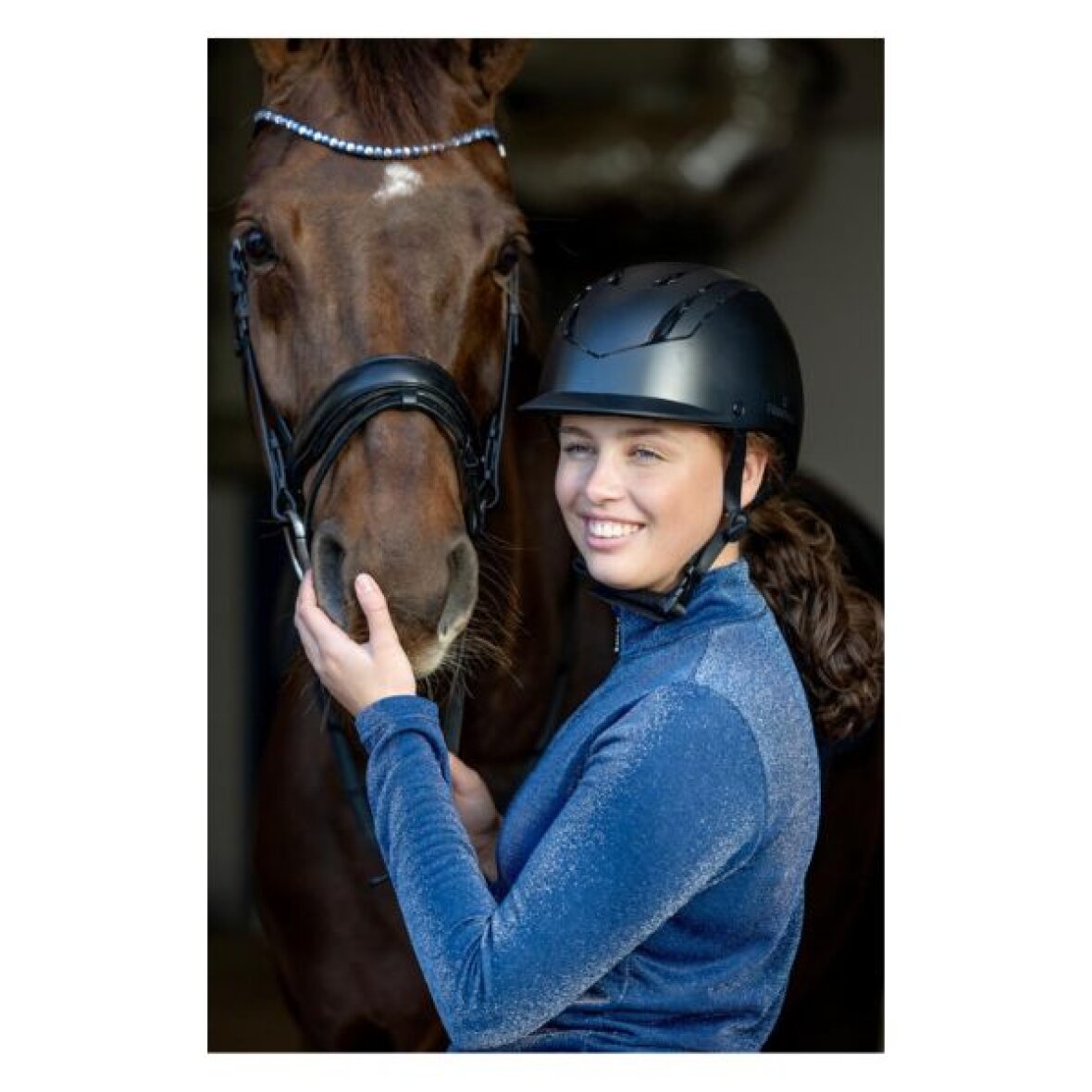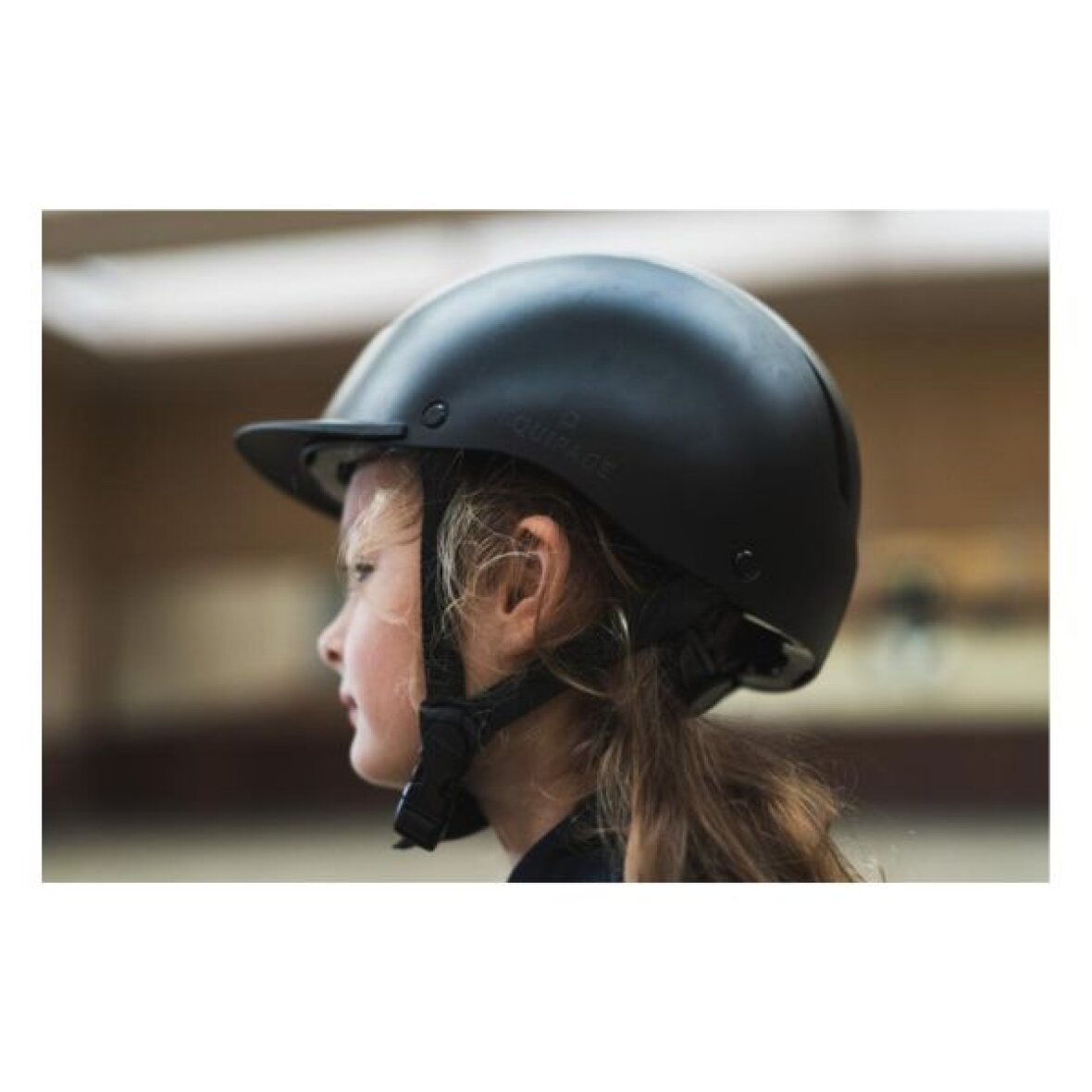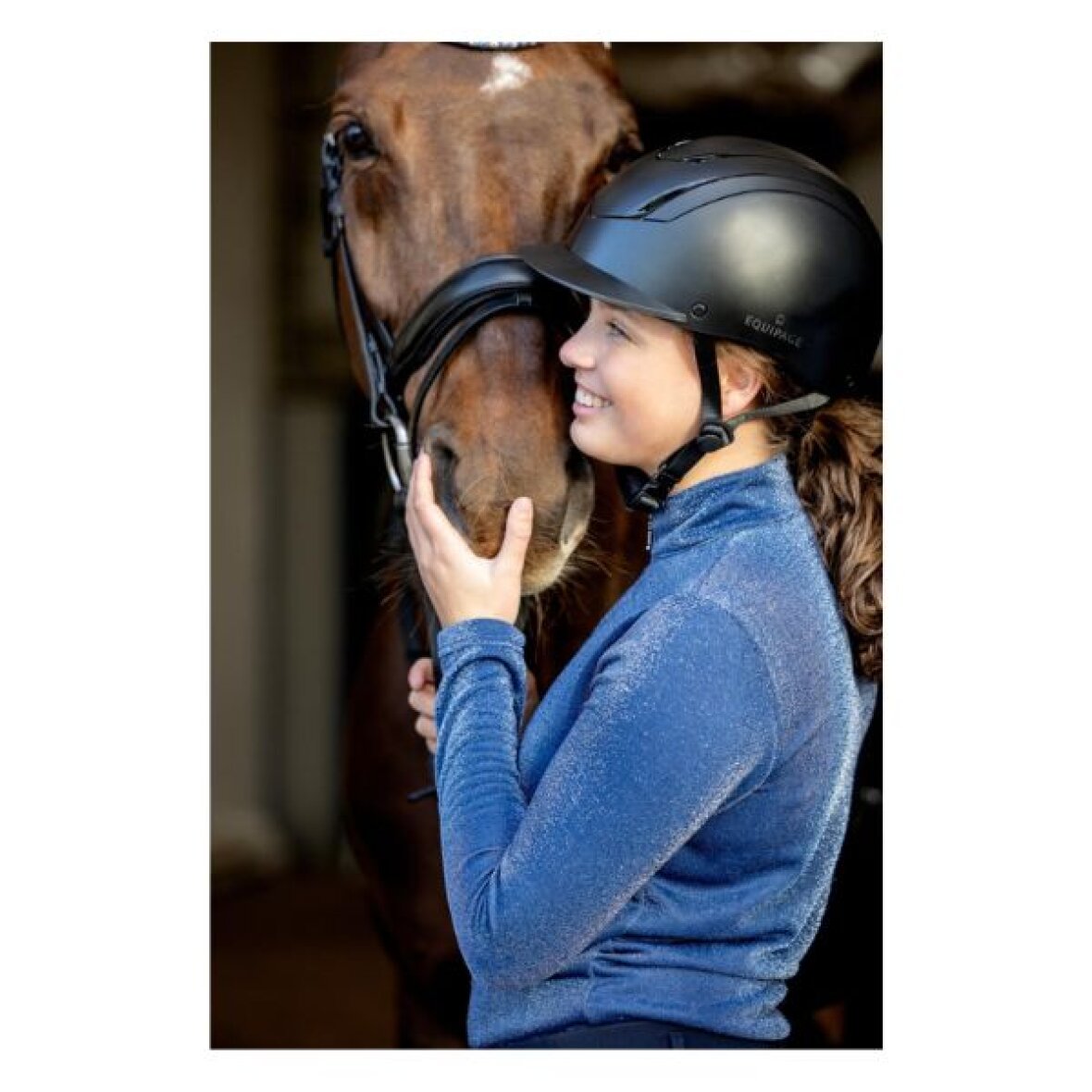 Ridehjelm fra Equipage i stilrent og moderne design med ekstra dækning bagtil og ved tindingerne. Farven er integreret direkte i ABS-materialet for en mere robust, holdbar og miljøvenlig finish. Drejejusteringssystem i nakken og justerbare sidestopper giver en sikker og individuelt tilpasset pasform med nem justering for optimal komfort hver gang. Den integrerede skygge beskytter øjnene mod sollys under ridning.