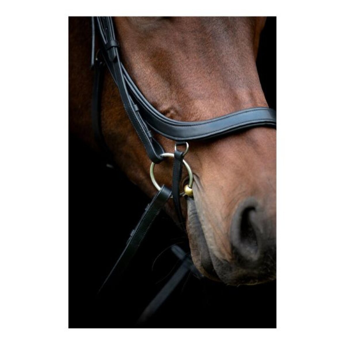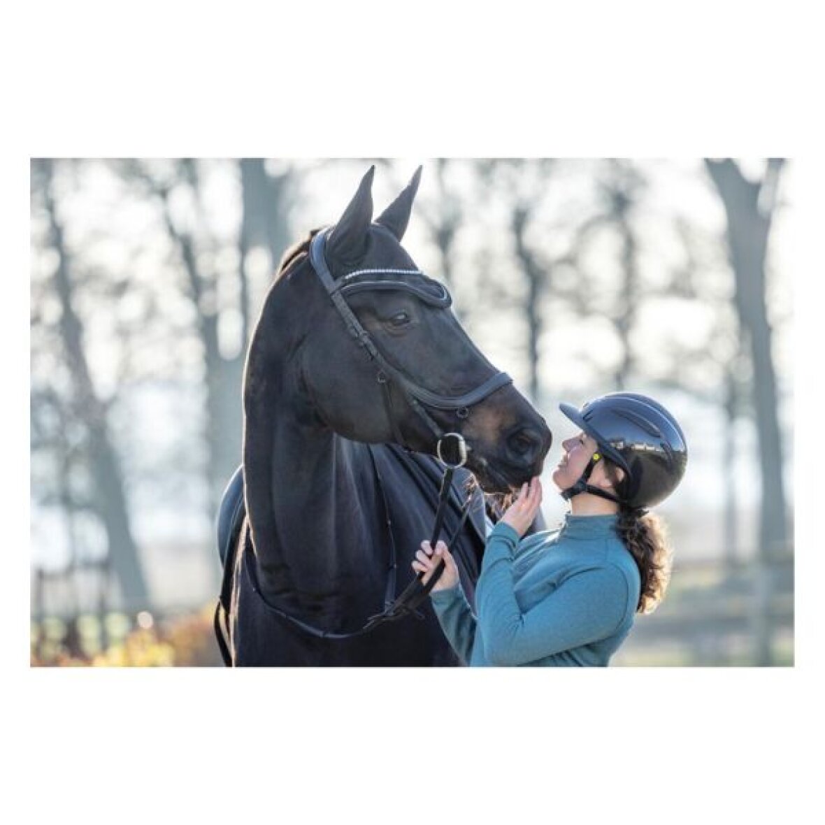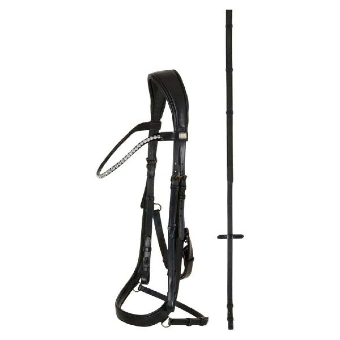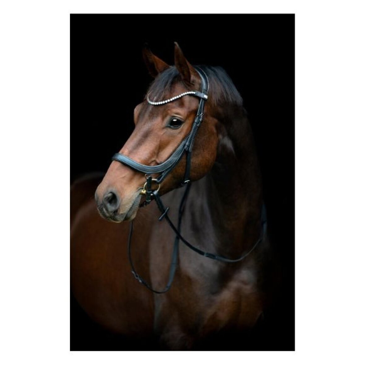 Trense fra HorseGuard med anatomisk næsebånd og blød læderpolstring. Det specialdesignede nakkestykke har ekstra blød polstring, som sikrer behagelig pasform og mindsker tryk på hesten. Pandebåndet er smukt dekoreret med store, sølvfarvede rhinsten, der giver et elegant og iøjnefaldende udtryk. Udstyret med hook-stud lukning ved biddets stropper for nem og sikker fastgørelse. Leveres med 16 mm supergrip tøjler for optimalt greb.
