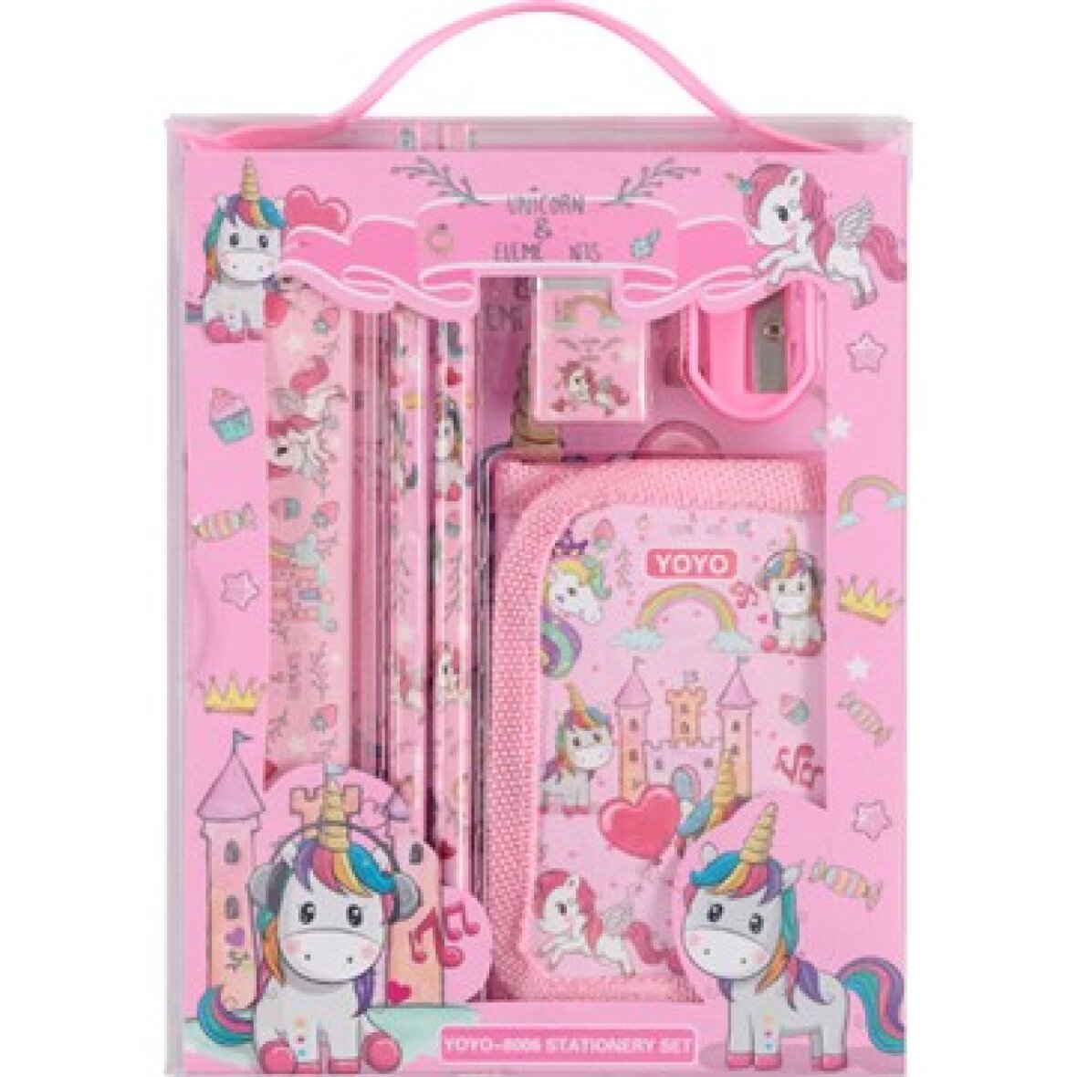 Skrivesæt der indeholder pung, blyanter, linial, blyantsspidser, viskelæder og notesblok.