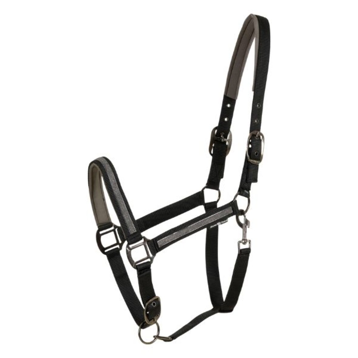 Grime fra HorseGuard med glimmerbånd på næsebånd og siderne. Lige neopren ved næsebåndet og formet neopren ved nakkeremmen. Grimen kan justeres 3 steder.
