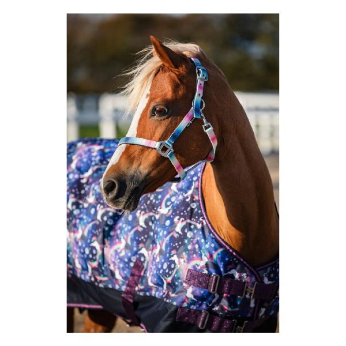Grime med gradient print fra HorseGuard. Lige neopren ved næsebåndet og formet neopren ved nakkeremmen. Nakkeremmen er justerbar.