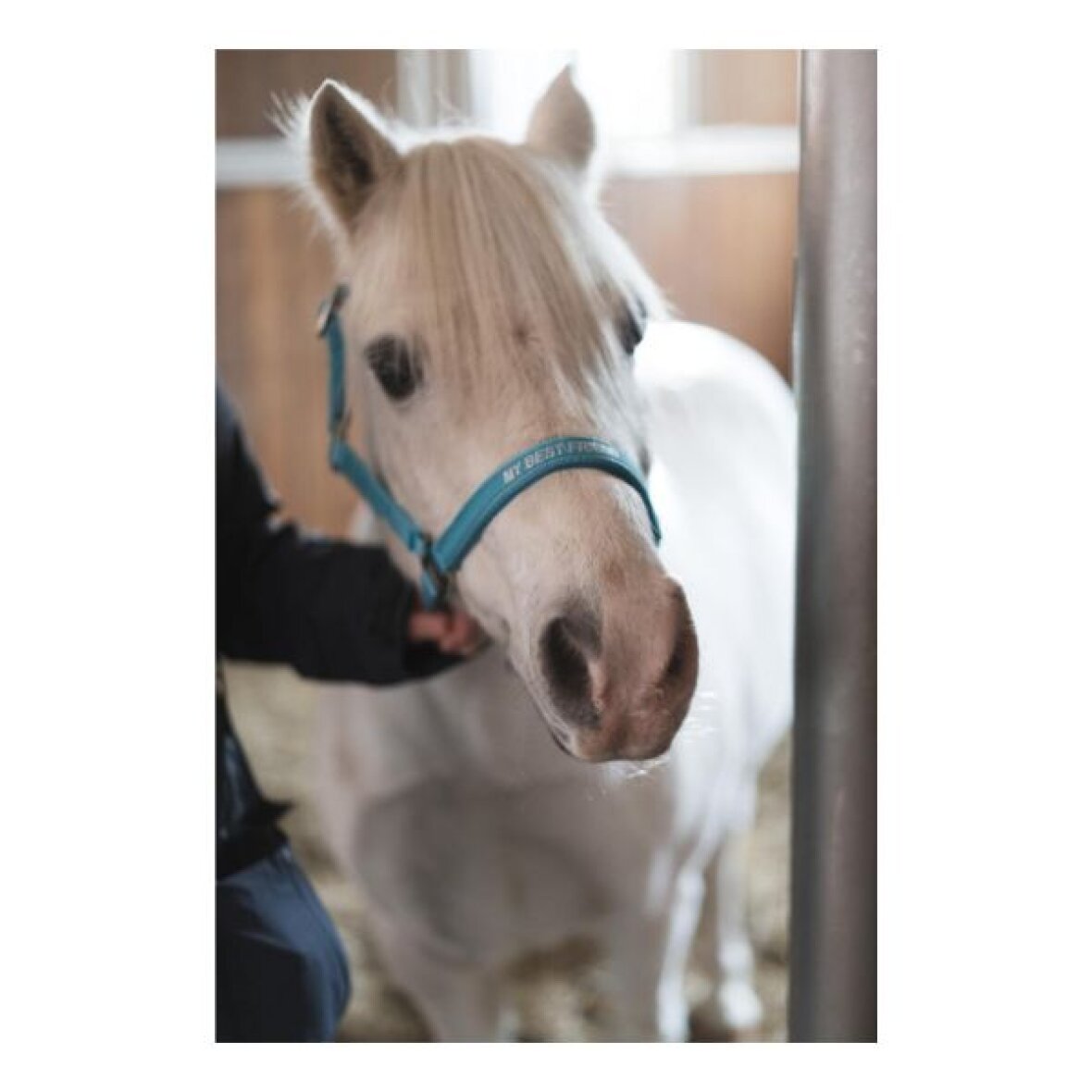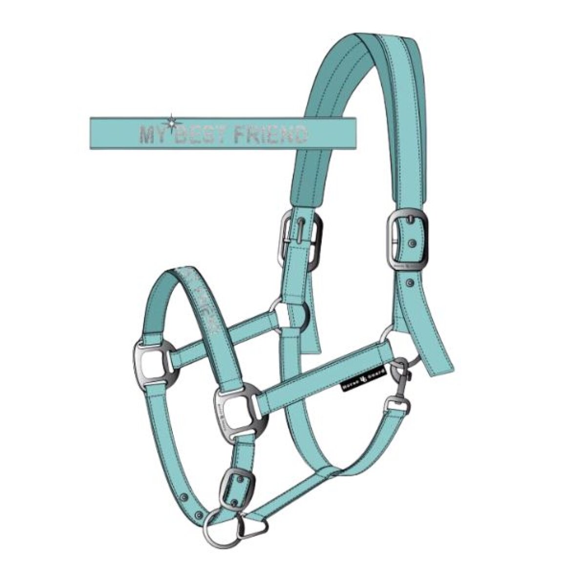 Lækker nylon grime fra HorseGuard. Grimen er med neopren foring i nakke og næserem. Den kan justeres i størrelse 3 steder og er med rustfrit stål spænder. Grimen er med tekst " MY BEST FRIEND " skrevet med sølv glitter tråd.