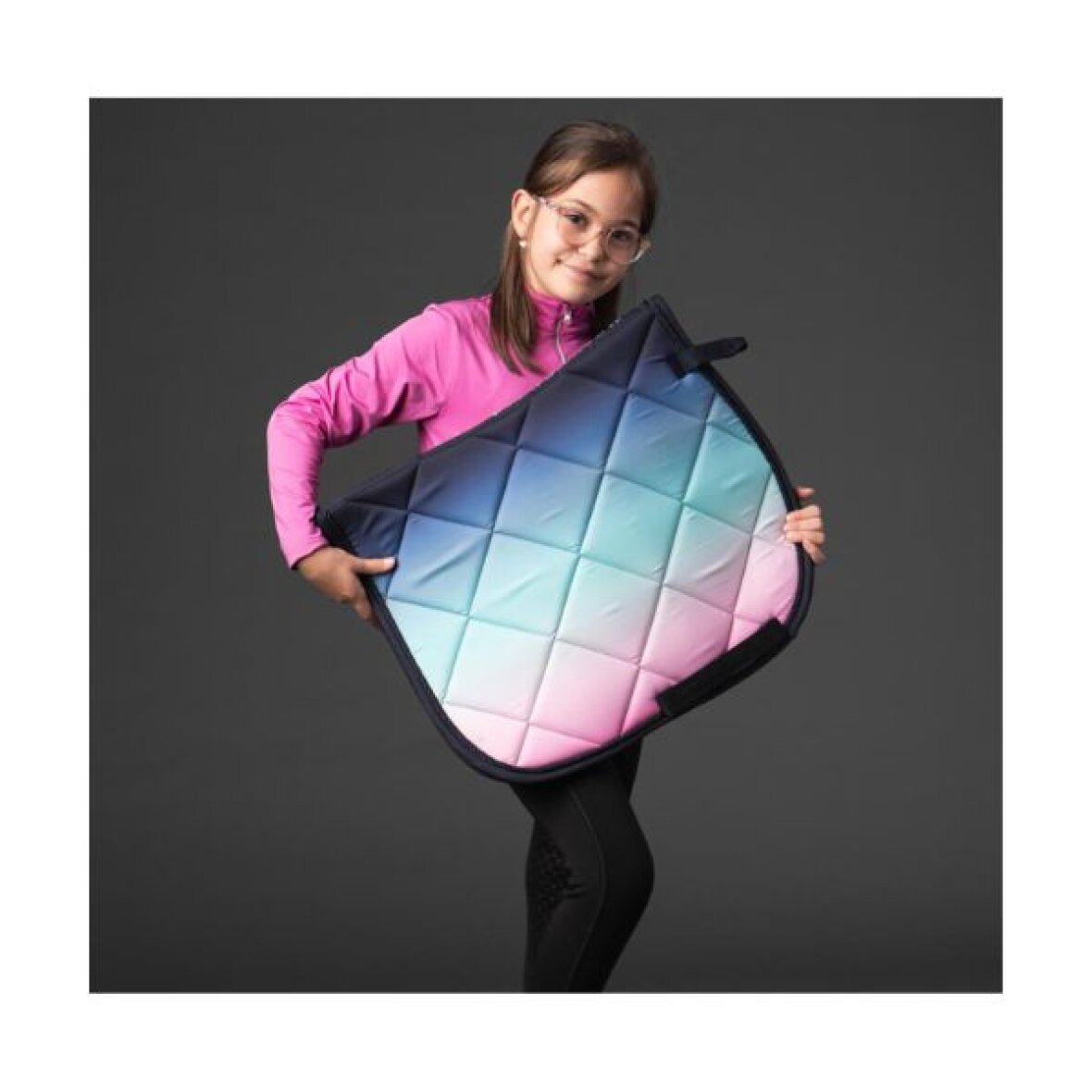 Dressur underlag fra HorseGuard med quiltning og et all-over gradient print. Underlaget har cool dry inderside med 10 mm skum og 200 gram fyld. Underlaget har flotte snoede kantbånd og sølv logo brodering på ryggen.