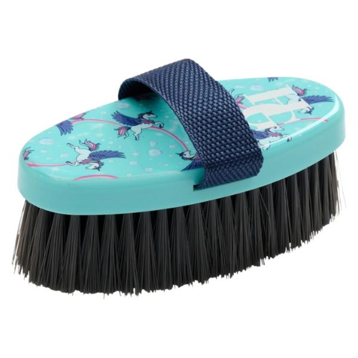 Lille sød kropsbørste fra HorseGuard. Denne børste er i turkis med enhjørninge motiv og et godt håndtag. Med bløde børster til at børste støv af hestens pels.