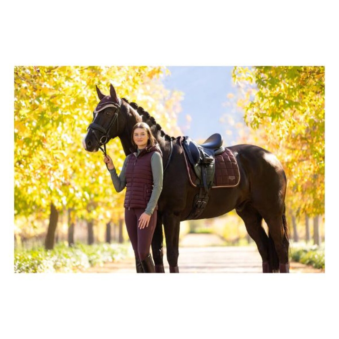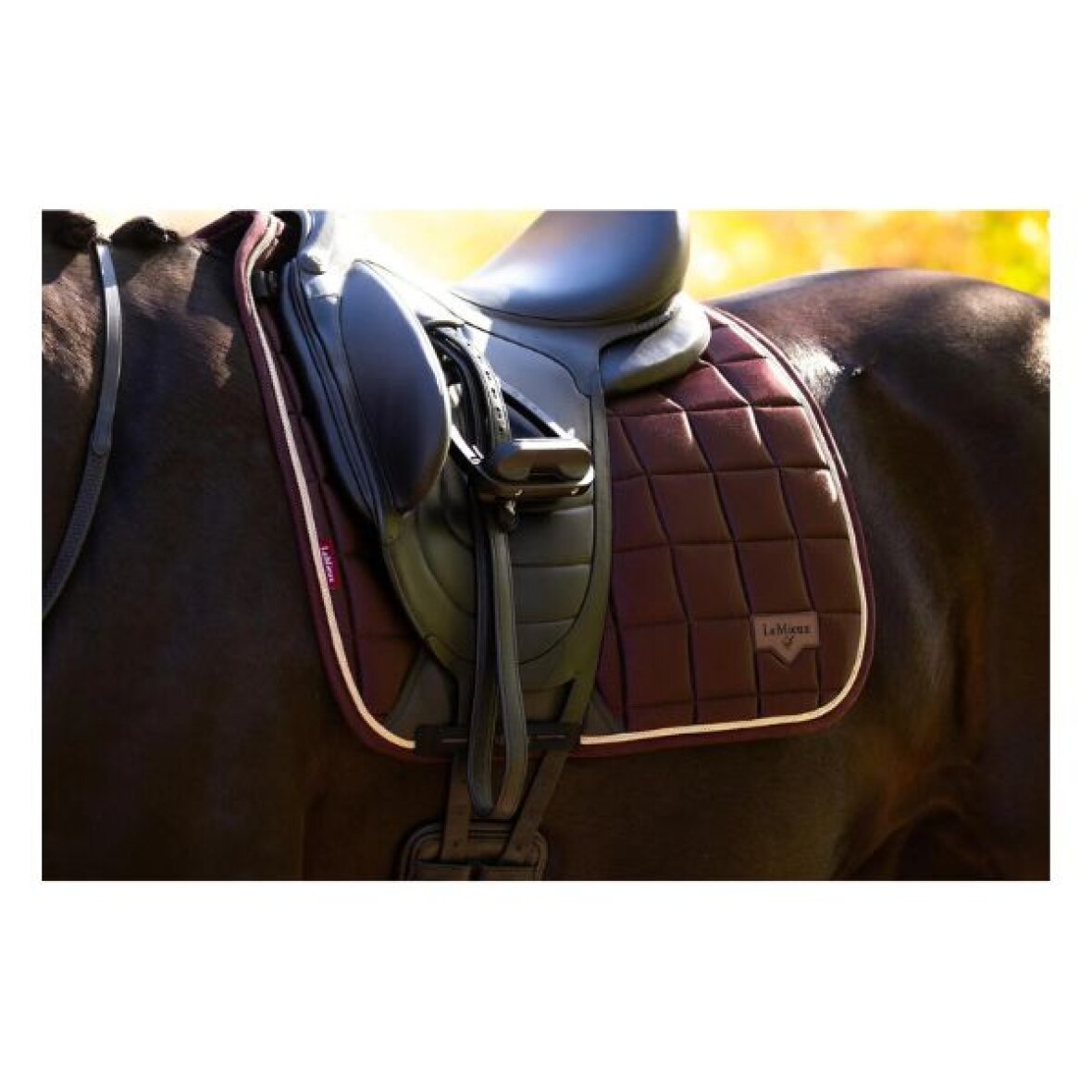 Dressur underlag fra LeMieux i vævet satin-stof på oversiden. En blød og åndbar bambusblanding på indersiden hjælper med at regulere varme og lede fugt væk, så din hest forbliver komfortabel under sadlen. Den høje mankefacon reducerer tryk og sikrer en god pasform, mens de elastiske sadelstropper er designet til at være slankere ved D-ringene og give plads til ekstra tilbehør. Underlaget har en blød, gnidningsfri kant, der følger formen og hjælper med at bevare underlagets form over tid. Gjordområdet er forstærket med PU-læder og udstyret med det klassiske LeMieux-logo samt gjordrem med indvendige løkker. Underlaget afsluttes med et metalbadge med LeMieux-logoet på en læderplade i hjørnet og et flot kantbånd i kontrastfarve.