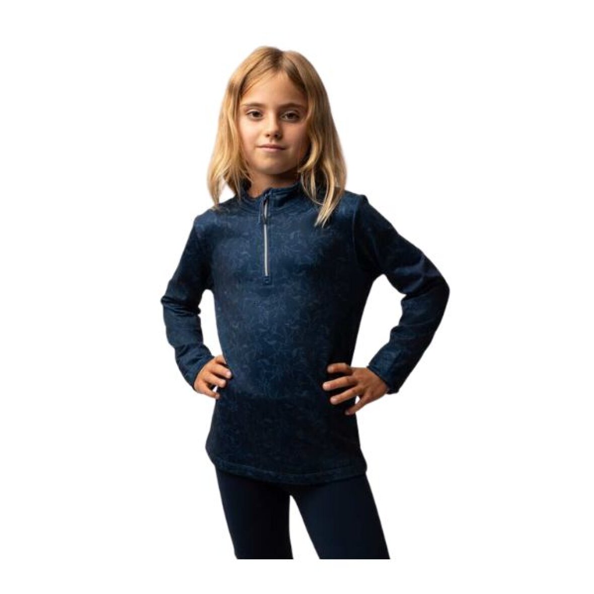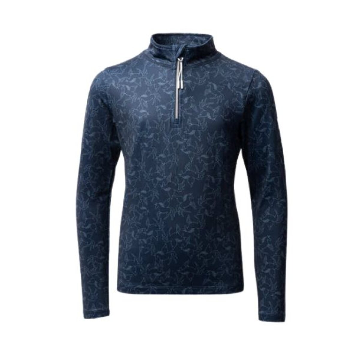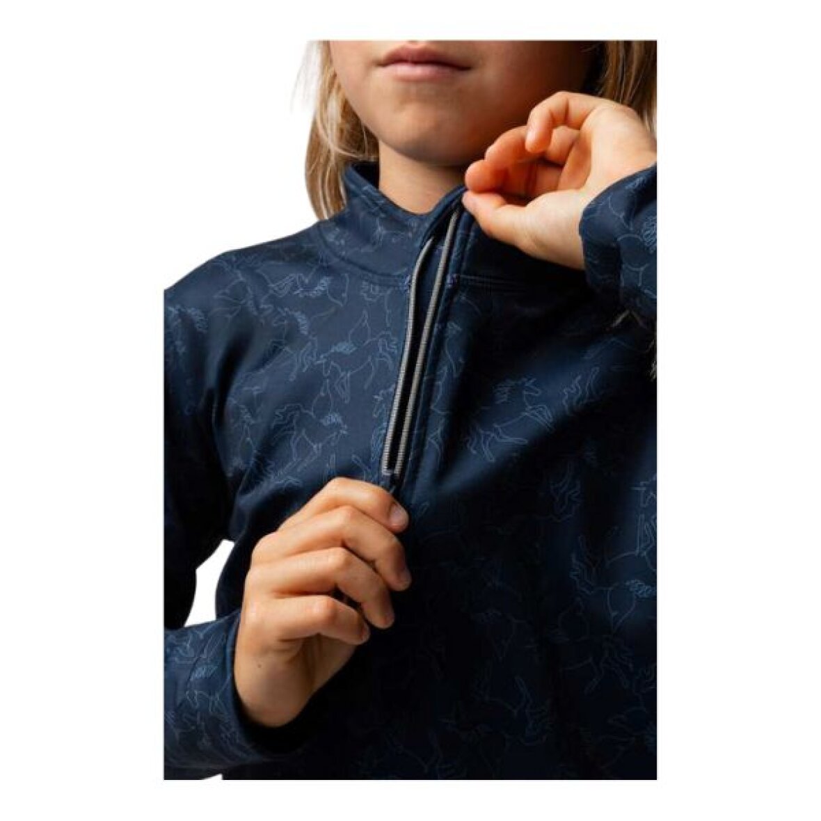 Børne træningsbluse fra Horze med det fineste all over Pegasus motiv. Fremstillet af materiale som er åndbart, isolerende og har massere af stræk, hvilket giver god komfort og bevægelsesfrihed. Blusen har en kvart lynlås ved halsen, Horze-logo på armen og børstet indvendigt stof.