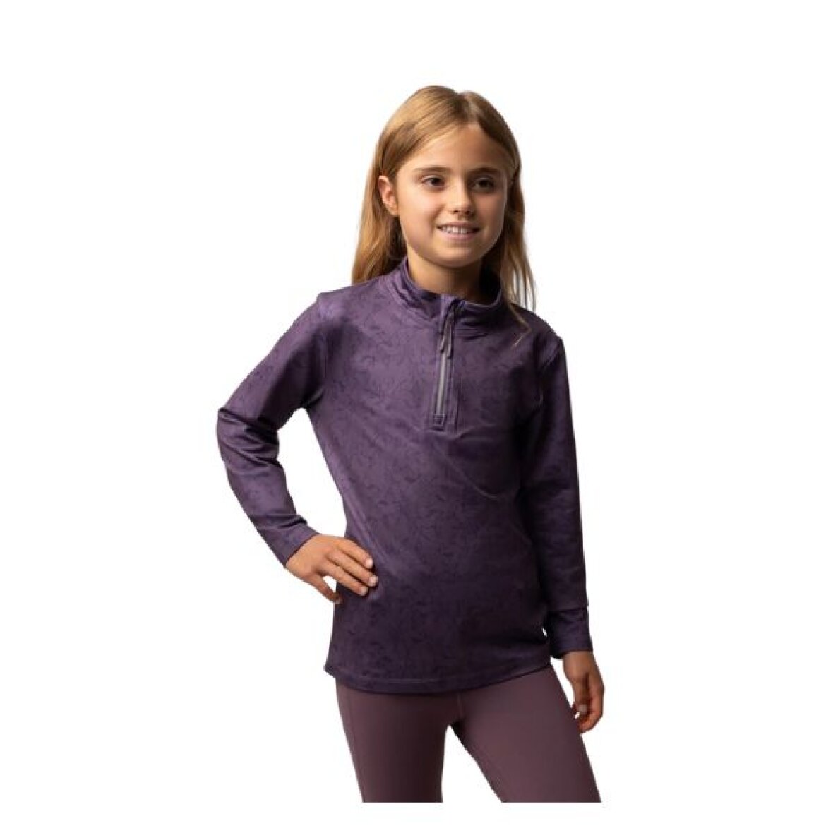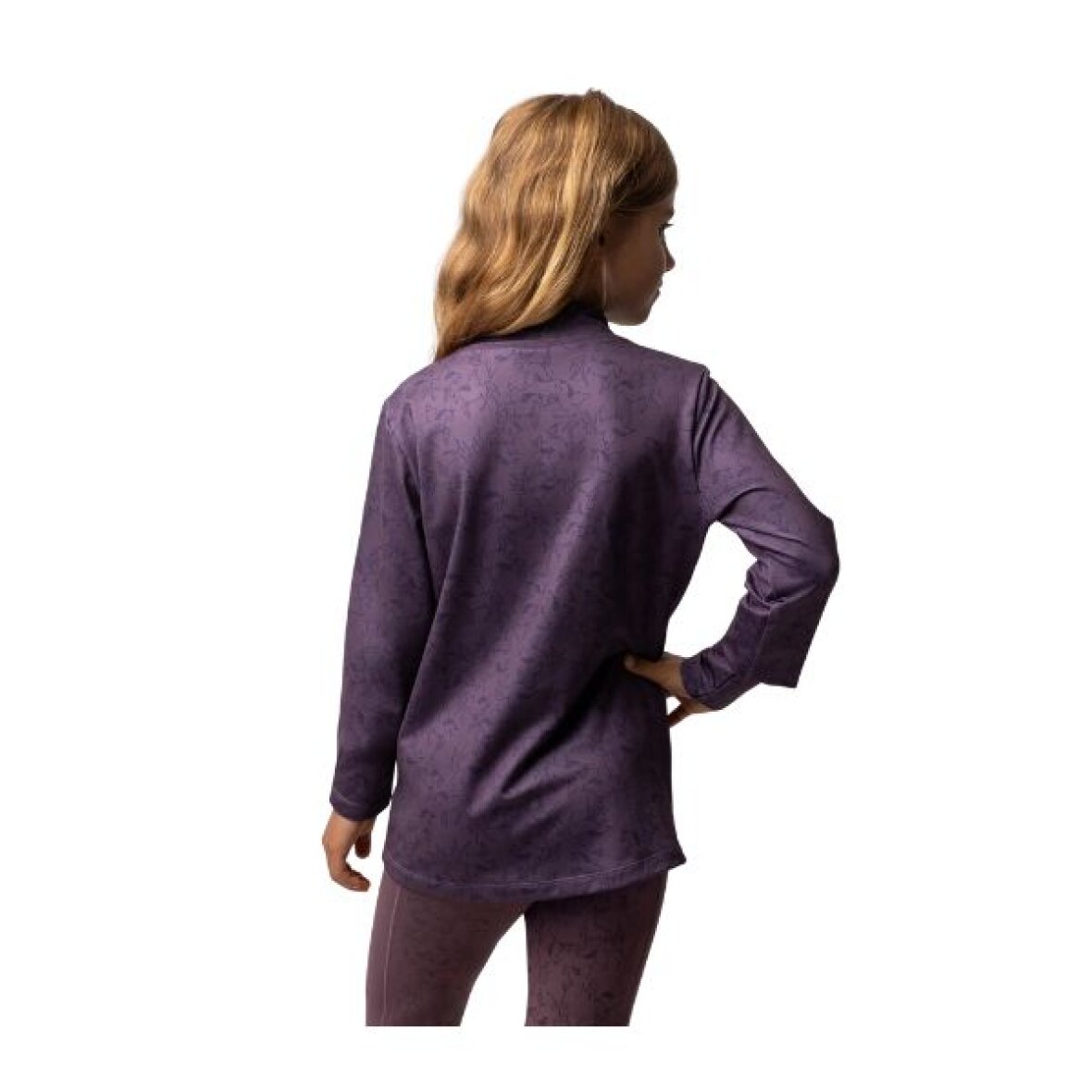 Børne træningsbluse fra Horze med det fineste all over Pegasus motiv. Fremstillet af materiale som er åndbart, isolerende og har massere af stræk, hvilket giver god komfort og bevægelsesfrihed. Blusen har en kvart lynlås ved halsen, Horze-logo på armen og børstet indvendigt stof.