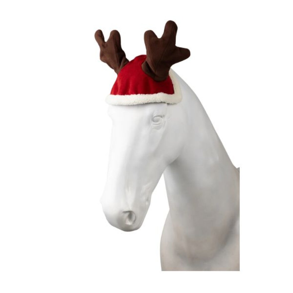 Jule hut med rensdyr gevir fra Horze. Hutten har huller til hestens øre og kan sidde under trensen eller grimen. Det bløde fleece i kanten og på indersiden giver et festligt udseende samtidig med at det er behageligt for hesten. Hutten har forstærket bundet stof, hvilket giver god holdbarhed.