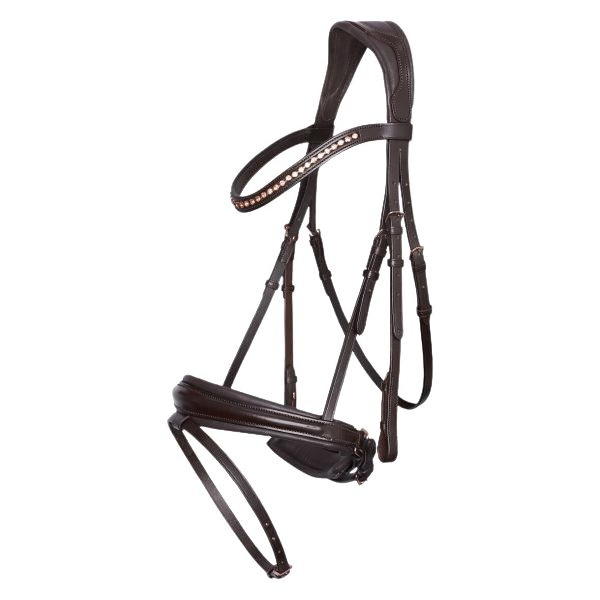 Super blød læder trense fra Imperial Riding. Denne trense er med anatomisk formet nakkestykke med blød foring. Flot pandebånd med rosegold krystaller og har et bredt foret næsebånd samt tilbagetræk. Trensen er med rustfrie metalspænder i rosegold-farve.