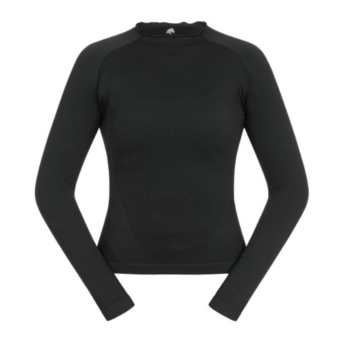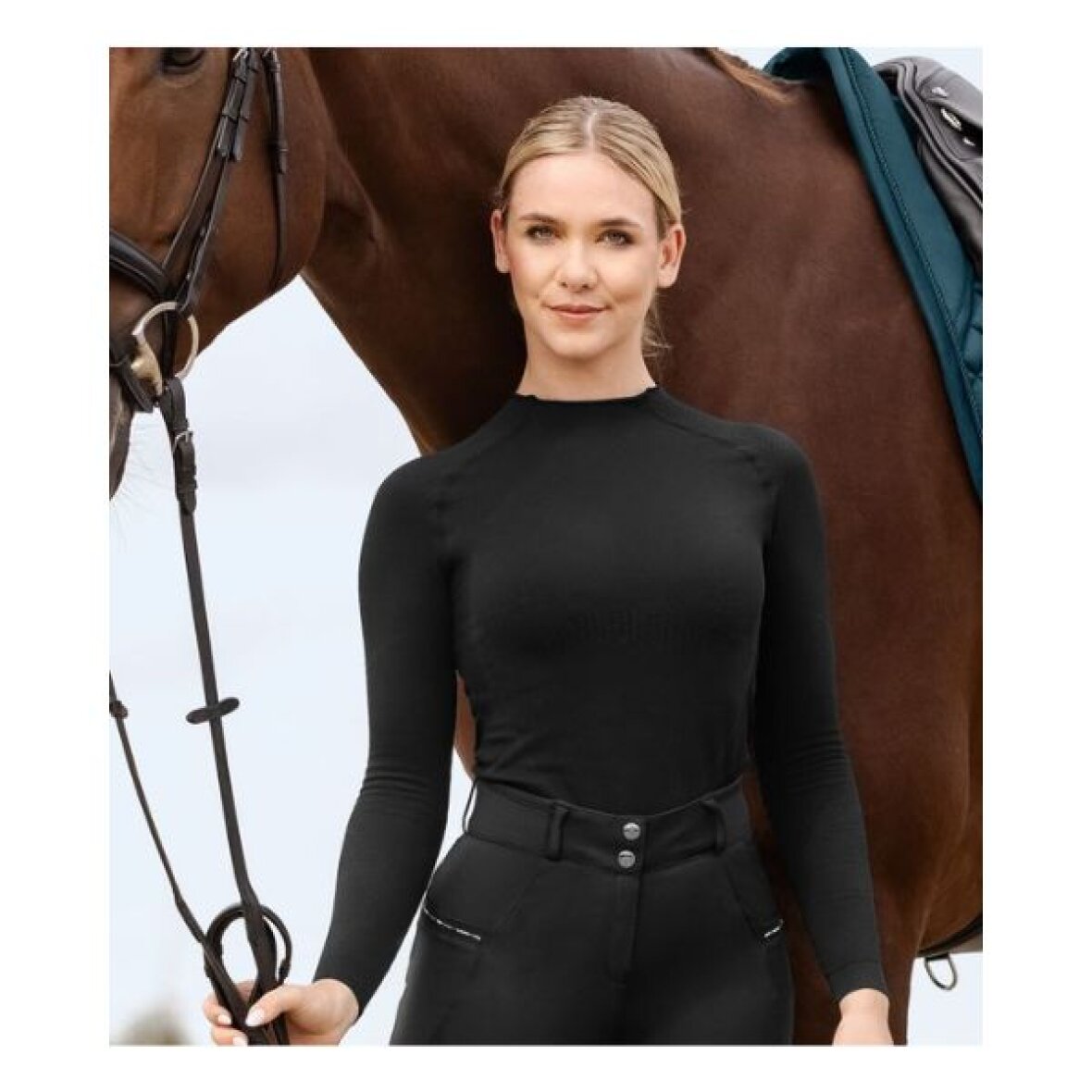 Teknisk ridetrøje fra ELT. Trøjen er sømløs og tætsiddende i teknisk 3D-strik med høj komfort og bevægelsesfrihed. De forskellige strikkede teksturer foran, bagpå, i siderne og ved halsudskæringen giver både funktion og et moderne look. Den sømløse konstruktion minimerer irritation og giver god bevægelsesfrihed. Ryggen prydes af ELT Equestrian-tekst.