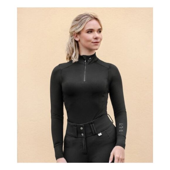 Funktionel trøje fra Waldhausen med lynlås og lange ærmer Stilren og figursyet langærmet trøje i åndbart, teknisk materiale, hvilket gør den ideel til både ridning og aktiv fritid. Trøjen har en skjult lynlås foran, høj krave med logoprint og dekorativt bånd i nakken. Ærmet er prydet med ELT-logo i glitrende rhinsten for et elegant touch.