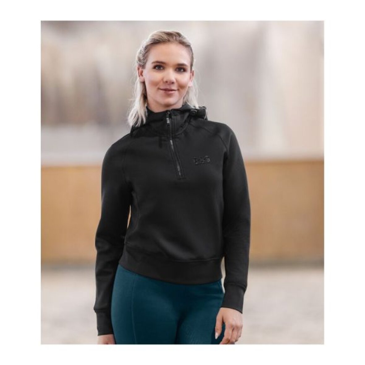 Løstsiddende hoodie fra ELT. Denne hoodie er lavet i et åndbart og teknisk materiale, der giver høj komfort og god bevægelsesfrihed, hvilket gør den ideel til både ridning og fritid. Hætten har justerbare elastiksnøre, og ved halsen findes en kvalitetslynlås i metal-look med snortræk og ELT-logo.