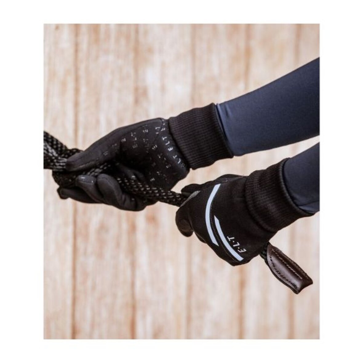 Vinter ridehandsker til børn fra ELT. Handskerne er fremstillet i et bi-elastisk termo materiale, der er både vindtæt og vandafvisende. Den bløde, varme foring og de strikkede manchetter sikrer ekstra komfort og beskyttelse mod kulde. Håndfladen har ELT-logo silikoneprint for et godt greb om tøjlerne, og forstærkning ved tøjleområdet, som giver øget slidstyrke. Handskerne er touchscreen-kompatible, så du nemt kan bruge din smartphone uden at tage dem af. På håndryggen findes et reflekterende E·L·T-logo for øget synlighed.