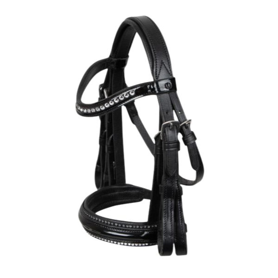 Weymouth trense til kæpheste fra Imperial Riding. Giv din kæphest et elegant look med denne flotte trense i ægte læder. Trensen har lak og rhinsten på næsebånd og pandebånd. Tøjler og bid medfølger ikke.
