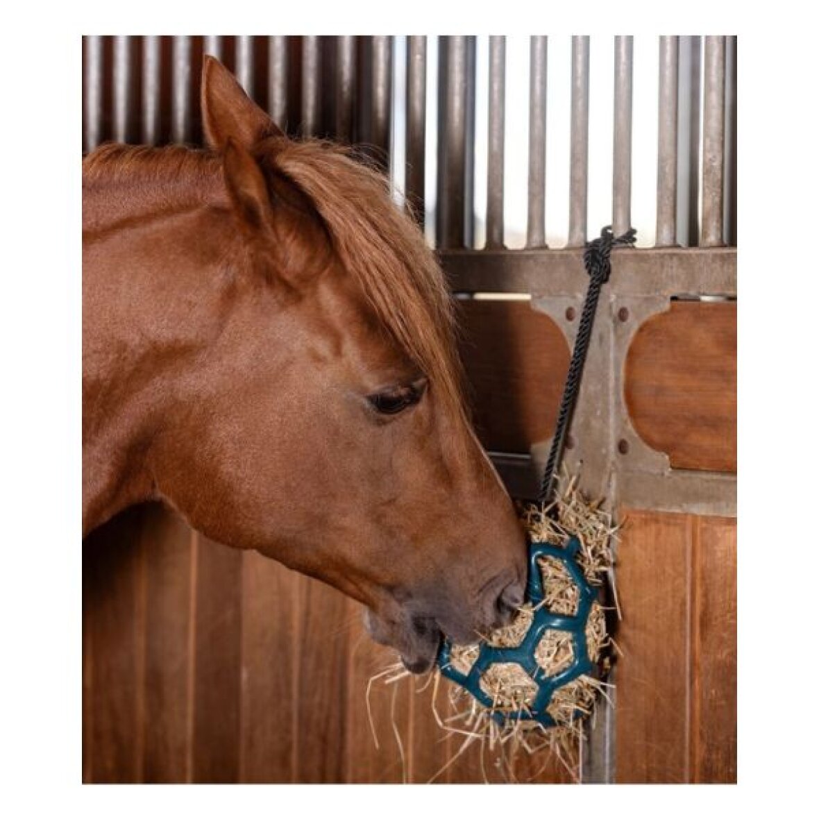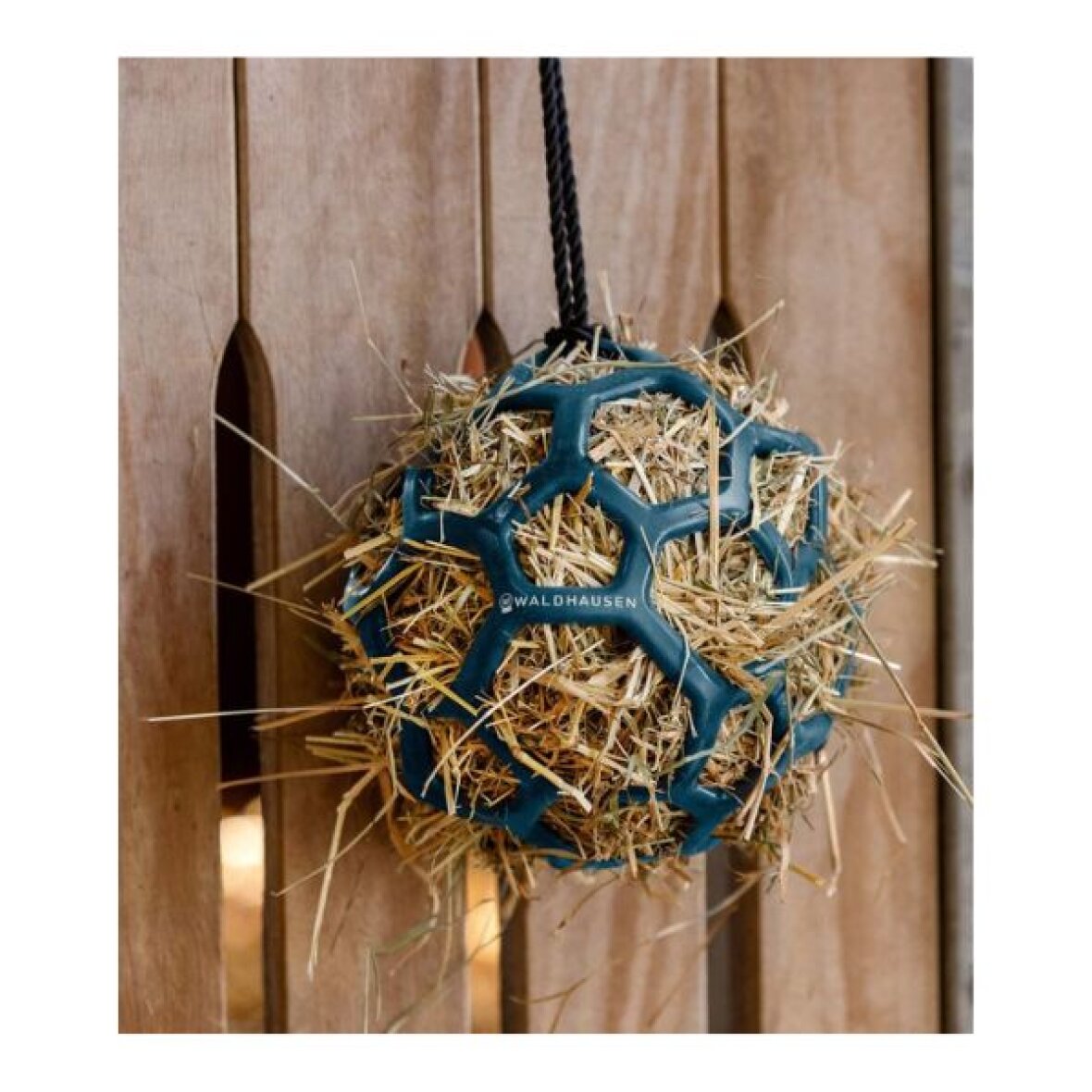 Høkuglen fra Waldhausen er ideel til at forhindre kedsomhed og bremse og rationere høindtaget. Dette er særligt skånsomt for maven og holder også hesten underholdt i timevis. Bolden kan sagtens fyldes med hø og andre godbidder, f.eks. gulerødder og æblestykker, og hængt op med den medfølgende 2 m lange rem. Den er udelukkende lavet af termoplastisk gummi, hvilket gør den særlig fleksibel og holdbar.