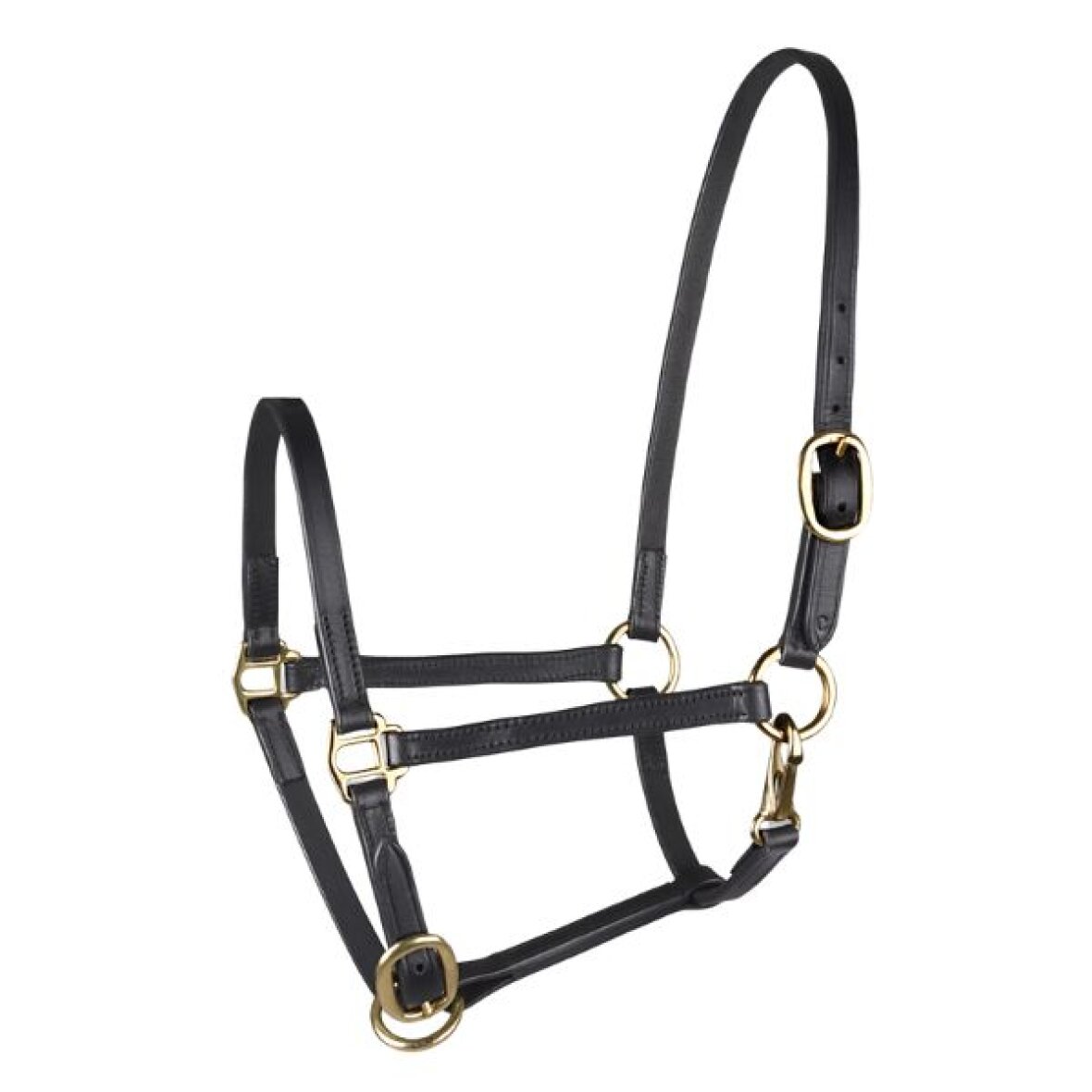 Enkel og elegant læder følgrime fra Waldhausen. Denne grime er sort med guldfarvet spænder. Den kan justeres i størrelse i næse- og nakkestykket.