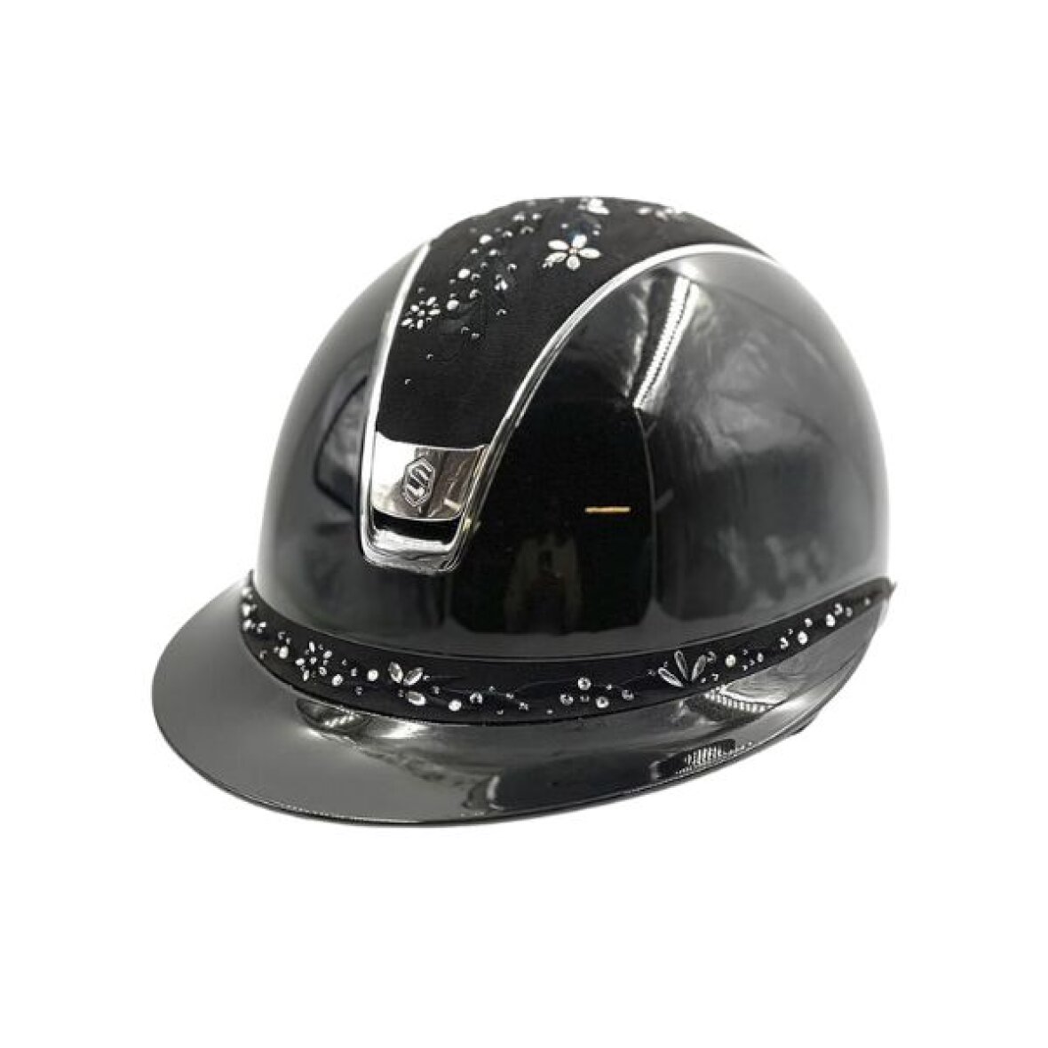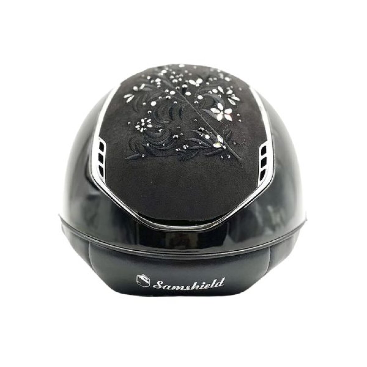 Samshield Miss Shield 2.0 ridehjelm i glossy med Flower Swarovski Jewellery top og front bånd. Blason og trimmen er chrome. Hjelmen er med EN1384:2023 godkendelse. Miss Shield 2.0 ridehjelmen har en mere oval pasform som gør at den kommer længere ned på hoved og om nakken. Miss Shield 2.0 har også fået et opgraderet luftindtag foran, som giver enestående ventilation, samt ridehjelmen har ingen direkte tryk på panden, så man undgår sved og hovedpine.