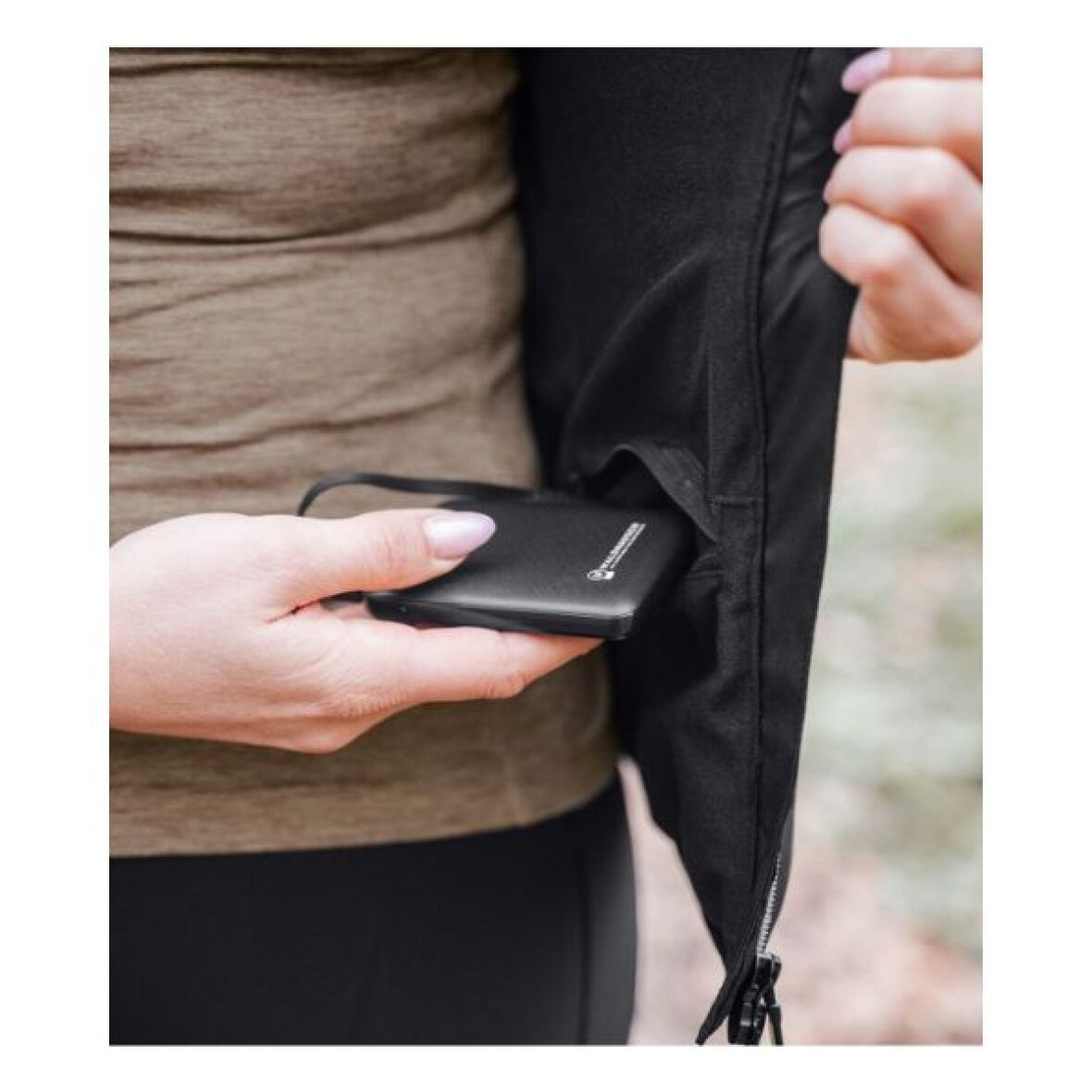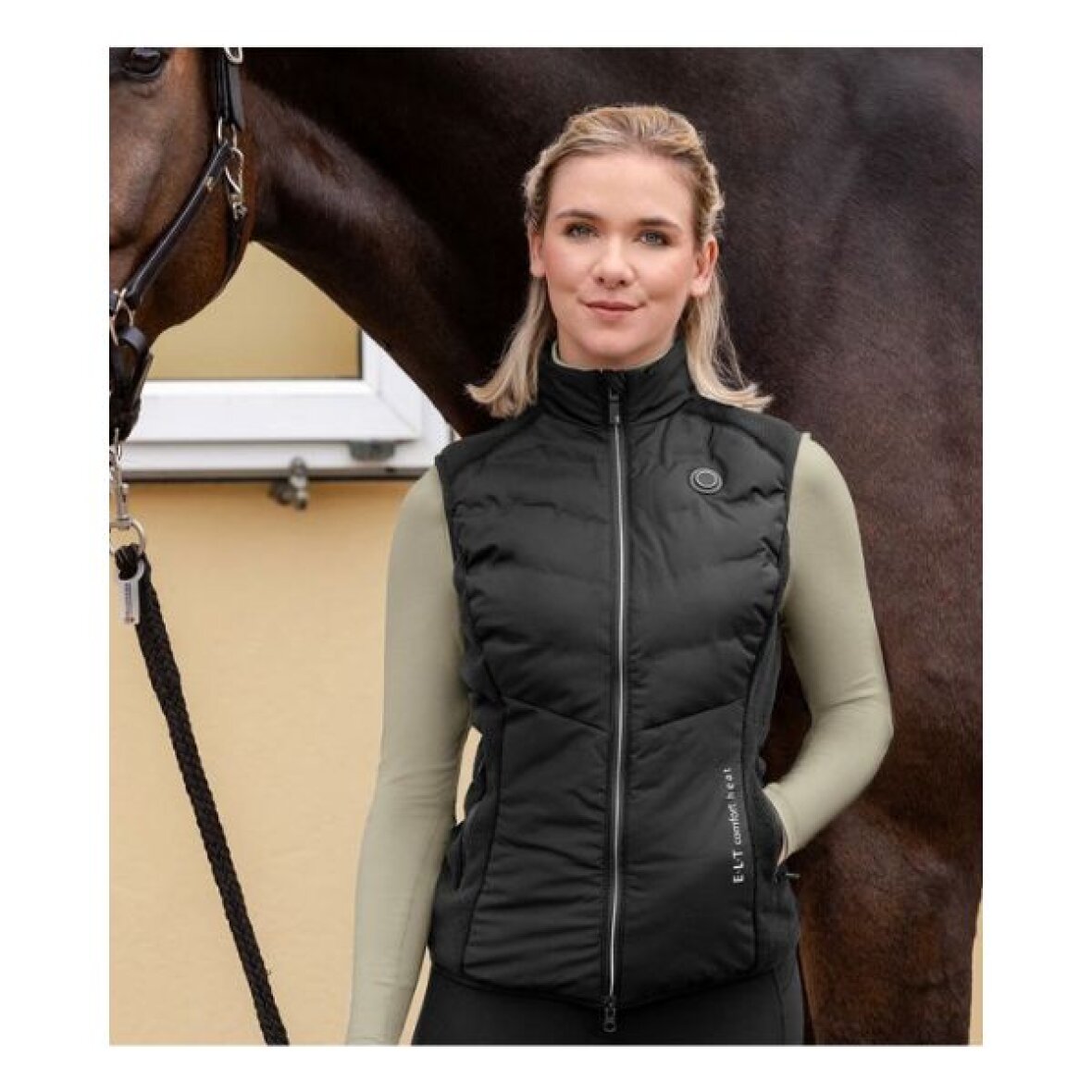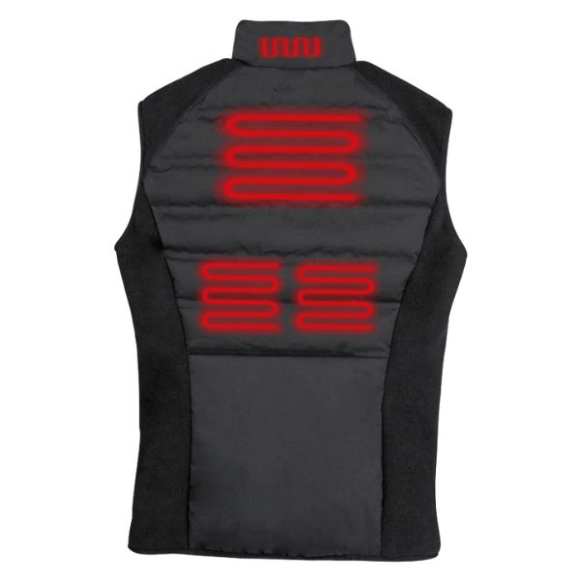 Vest fra ELT med varmeteknologi. Vesten har et let figursyet design med quiltet front og ryg i vindtæt og vandafvisende materiale, mens sider og skuldre er i blød fleece for ekstra fleksibilitet. En praktisk 2-vejs lynlås foran, to sidelommer med lynlås og elastiske afslutninger ved ærmegab og søm fuldender designet. Seks strategisk placerede varmezoner - tre i ryggen, to foran og én ved nakken - sørger for effektiv varmefordeling. Temperaturen justeres nemt via en knap med tre niveauer: 45 °C (blå), 50 °C (hvid) og 55 °C (rød). Varmefunktionen drives af en standard 5V/2A USB powerbank (medfølger ikke), som tilsluttes via det integrerede USB-kabel i vestens indvendige lomme.