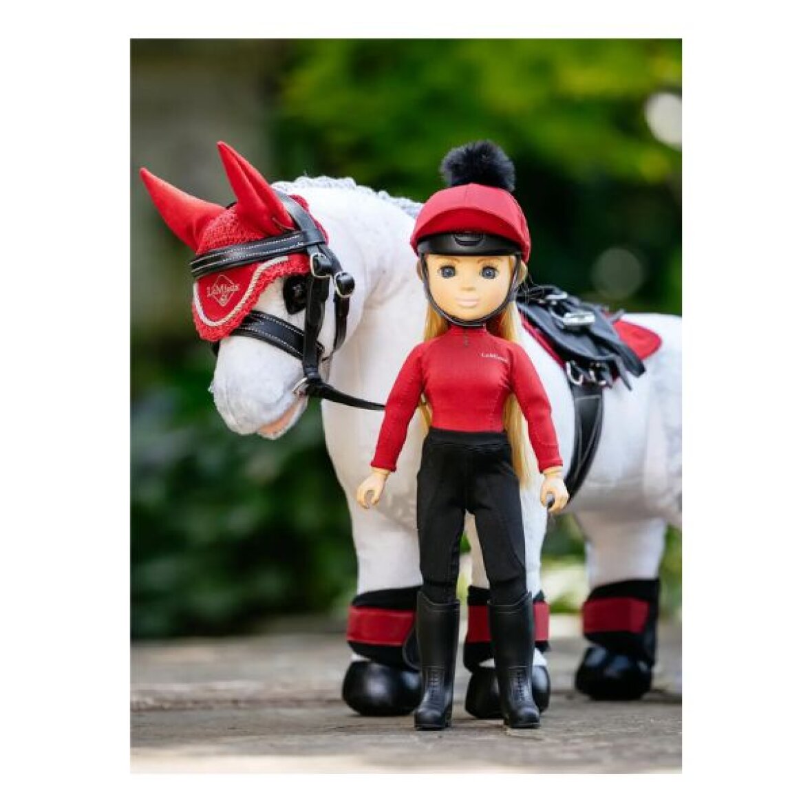 Mini toy rytteren Chloe fra LeMieux. Chloe er en af tre interaktive og fuldt bevægelige rytterdukker i høj kvalitet, hver med sin personlighed og tøjstil i LeMieuxs signaturfarver. Hun har langt, blondt hår med en naturtro struktur, der kan børstes, samt smukke, naturlige øjenvipper. Hun er iført aftageligt LeMieux rideudstyr i den iøjnefaldende farve Chilli Red inkl. ridehjelm og ridestøvler. Hun kan sidde korrekt i sadlen med hænderne på tøjlerne og fødderne i stigbøjlerne. Chloe kan stå selv og sidder stabilt på LeMieux Mini Toy Pony, når hun er korrekt placeret. Med Chloe kan børn skabe virkelighedstro legeuniverser, hvor de lærer om hestepleje og ridning gennem fantasifuld og sanselig rolleleg.