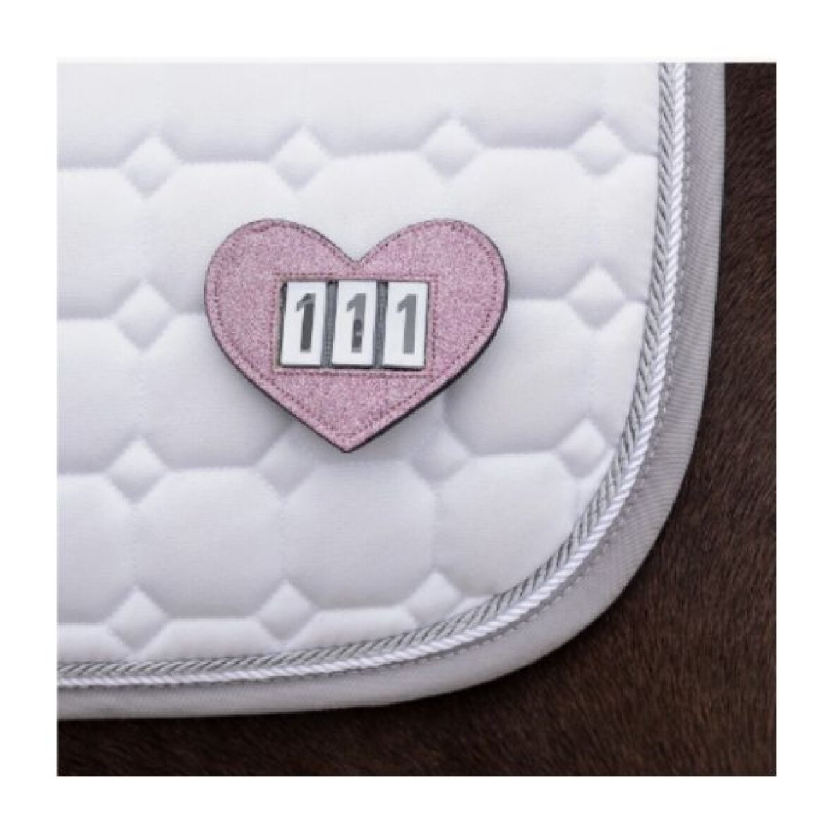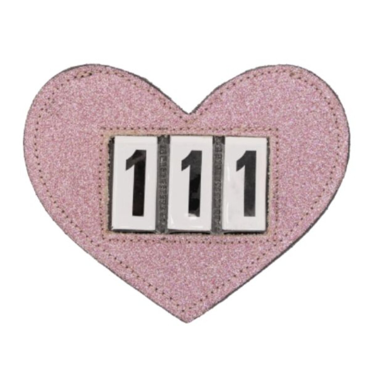 Stævnenummer i hjerte-form med diskret glitter fra QHP. Dette stævnenummer kan nemt fastgøres til trensen eller underlaget med sikkerhedsnåle eller velcro. Med 3 udskiftelige numre.