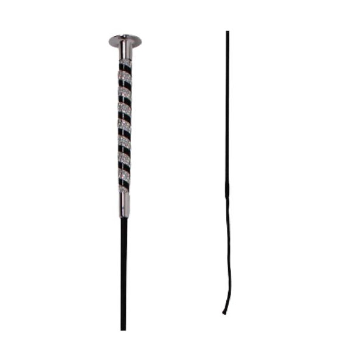 Holdbar og fleksibel dressurpisk fra QHP. Piskens håndtag er prydet med rhinsten og lak i et flot snoet design.