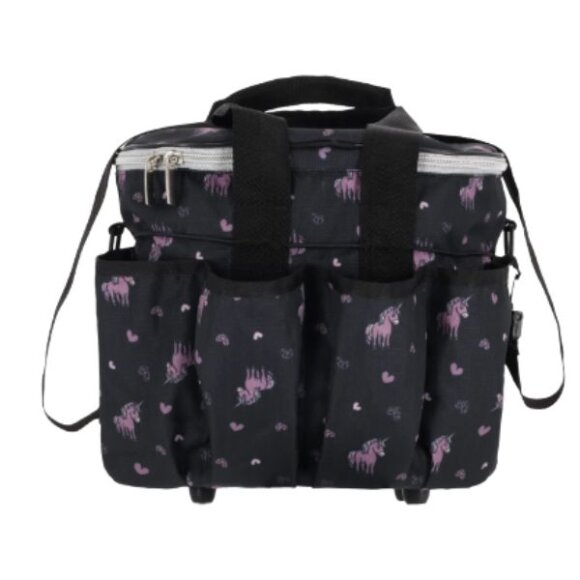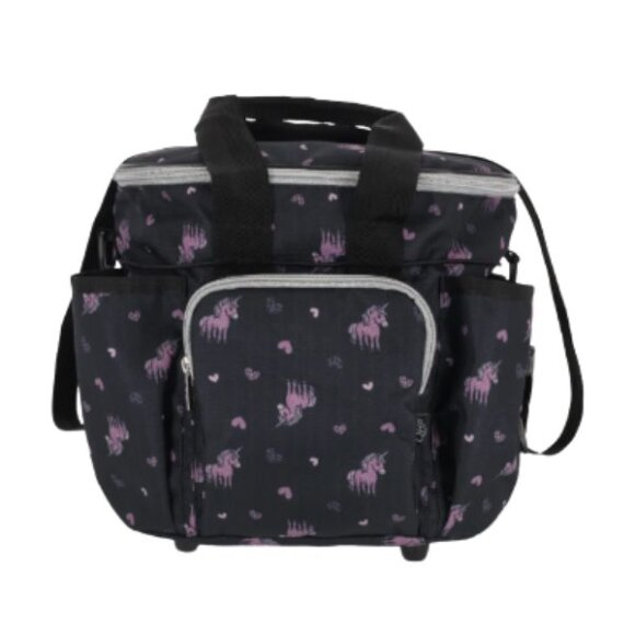 Strigletaske med sødt enhjørning-motiv fra QHP. Strigletasken kan lukkes med lynlås. Indvendigt er der en lomme med lynlås, en gennemsigtig lomme til et kort og to løkker til kuglepenne. Der er forskellige lommer rundt om tasken til ting som en vandflaske eller spray. Derudover er der en lynlåslomme på forsiden. Tasken har en skulderrem og håndtag for nem transport.