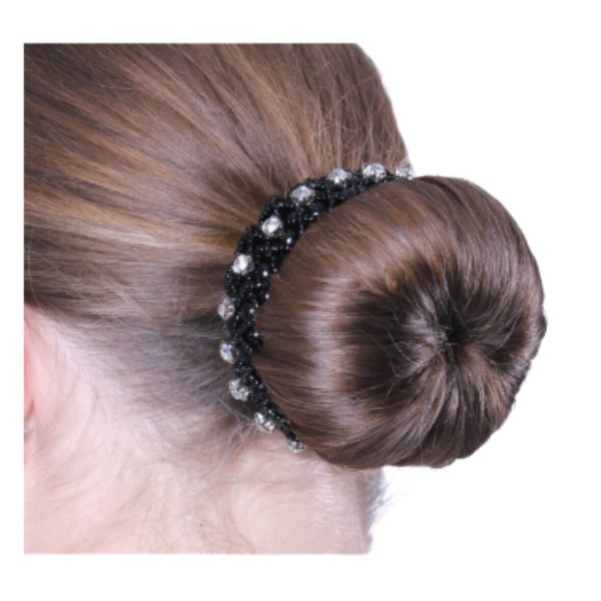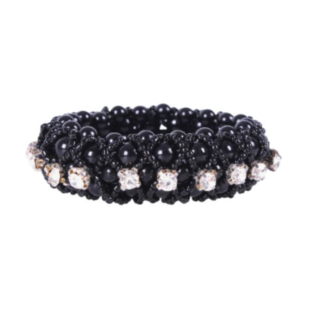 Elastisk hårpynt fra QHP med perler i forskellige størrelser og rhinsten imellem. Denne hårpynt dekorerer smukt din opsatte stævneknold.