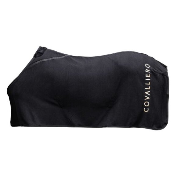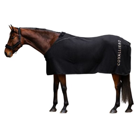 Fleece tæppe fra Covalliero med logo på siden. Det åndbare materiale transporterer effektivt sved væk fra kroppen og holder hesten tør og komfortabel. Blødt kunstpels ved manen beskytter og øger komforten omkring manen. Dækkenet er udstyret med et praktisk frontspænde, halerem samt justerbare og aftagelige krydsgjorde, som sikrer en god pasform.