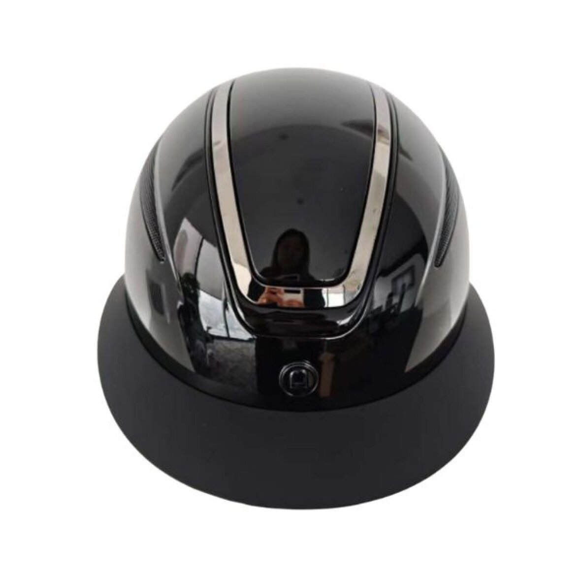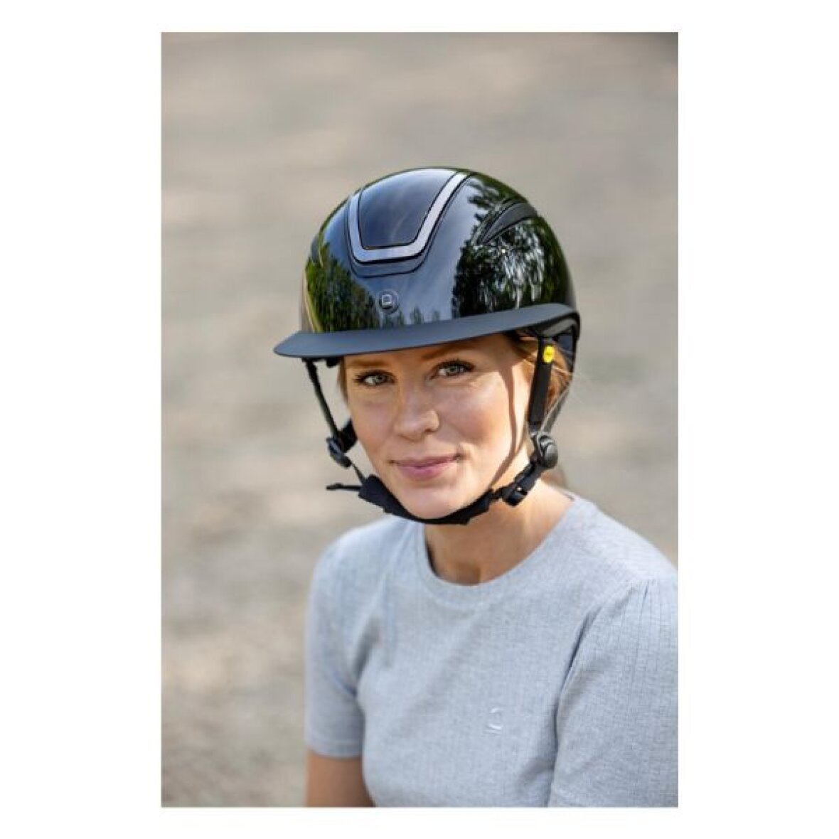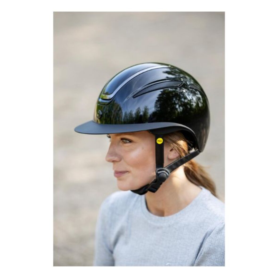 Ridehjelm fra Equipage med implementeret MIPS-system. Ridehjelmen er sort glossy med en krom trim. Ridehjelmen har en slidstærke yderskal i ABS-materiale, der effektivt beskytter mod slag, mens ventilationszoner i air mesh holder hovedet køligt. Indvendigt har hjelmen et udtageligt memory foam-indlæg, der former sig efter hovedet og sikrer optimal komfort og pasform. Størrelsen justeres nemt med det roterende drejehjul i nakken, så hjelmen altid sidder præcist, som den skal. De justerbare stropper sikrer en stabil og sikker tilpasning under alle forhold. Ridehjelmens brede skygge giver ekstra solbeskyttelse samt et elegant udtryk.