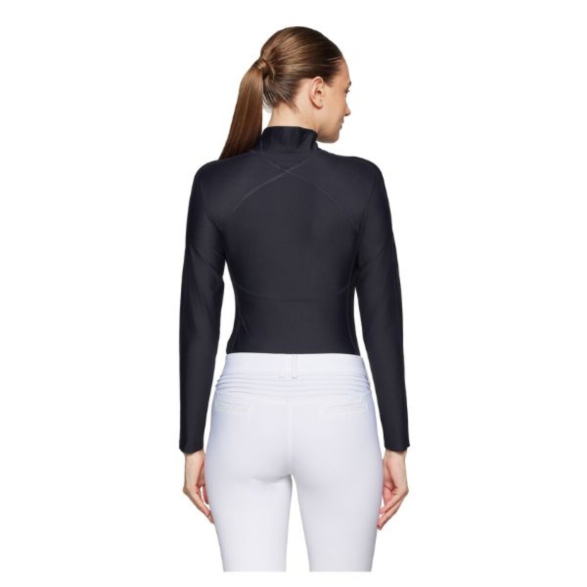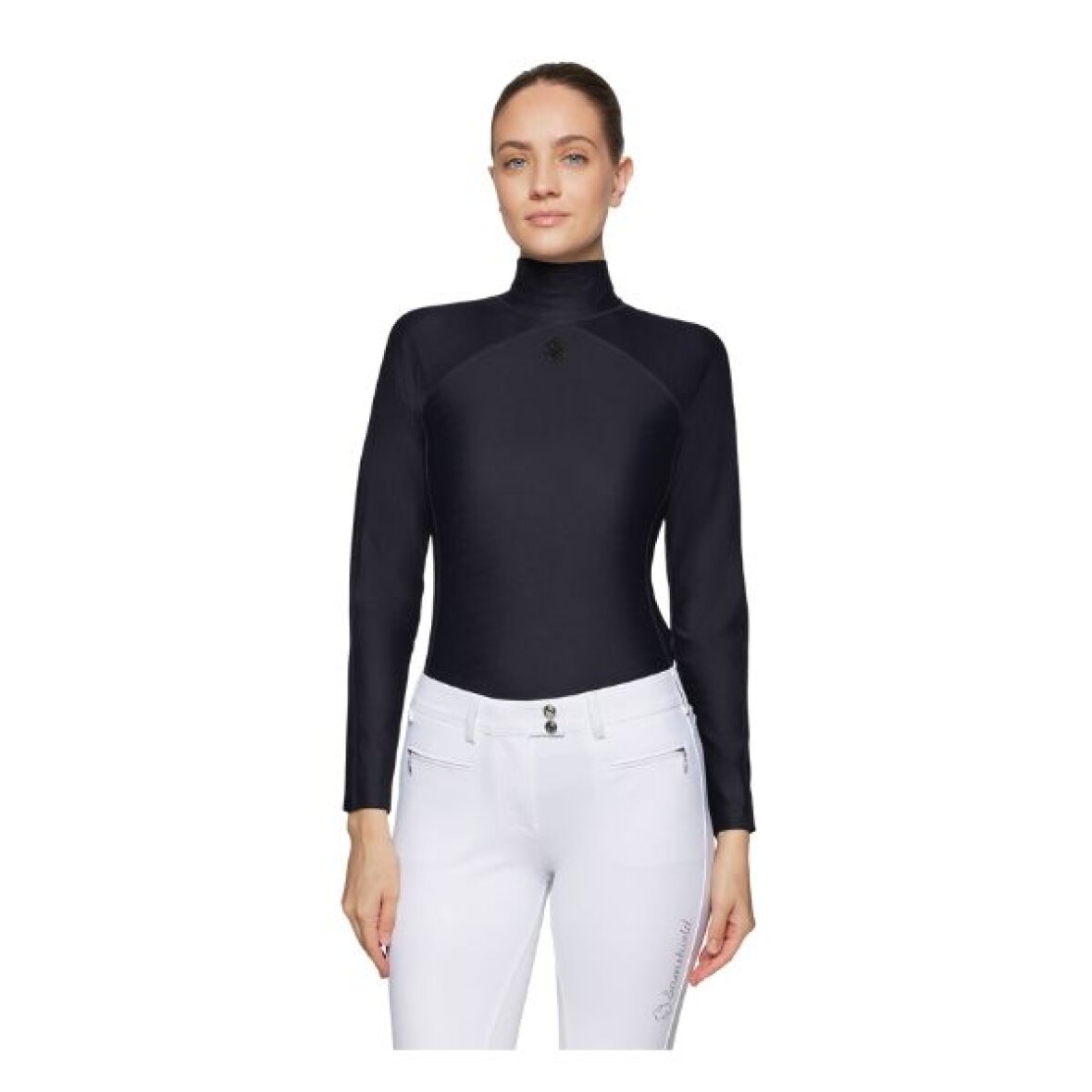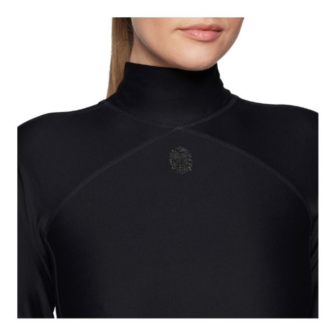 Træningstrøje med høj hals og lange ærmer fra Samshield. Trøjen har Samshield logo i Swarovski krystaller på fronten og Swarovski krystaller på halsen i ryggen. Flade tone-i-tone søm på trøjen giver trøjen fine ekstra detaljer. Trøjen er fremstillet i åndbart og strækbart materiale, som giver god komfort for rytteren. Materialet er med anti-pilling finish, så trøjen holder over tid.