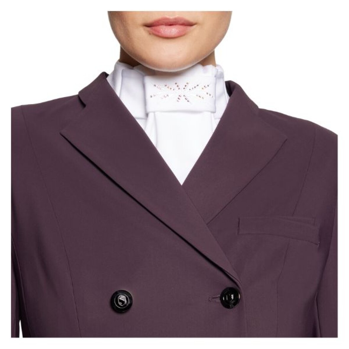 Elegant hvid plastron fra Samshield med Swarovski krystaller og broderi øverst. Samshield logo for enden. Fremstillet i åndbart, strækbart og anti-pilling materiale for optimal komfort og holdbarhed. Den lukkes med velcro i nakken.