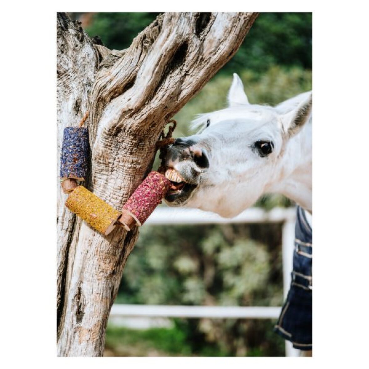 Træ tyggelegetøj fra Candy Horse som hjælper med at reducere kedsomhed i stalden. Legetøjet er lavet af frisk, ubehandlet birke- og fyrretræ, som bevarer sin naturlige duft og harpiks, og giver hesten en autentisk fornemmelse af skov og natur. Tre nøje udvalgte urter - morgenfrue, kornblomst og vild rose - tilfører legetøjet vitaminer, antioxidanter og plejende egenskaber for hud og slimhinder. Samtidig har legetøjet æteriske olier fra lavendel, eukalyptus, pebermynte og citron, som skaber en naturlig aromaterapieffekt. Duften virker både beroligende og opløftende og gør oplevelsen til noget helt særligt for hesten. Legetøjet er fri for sukker, konserveringsmidler og kunstige tilsætningsstoffer.