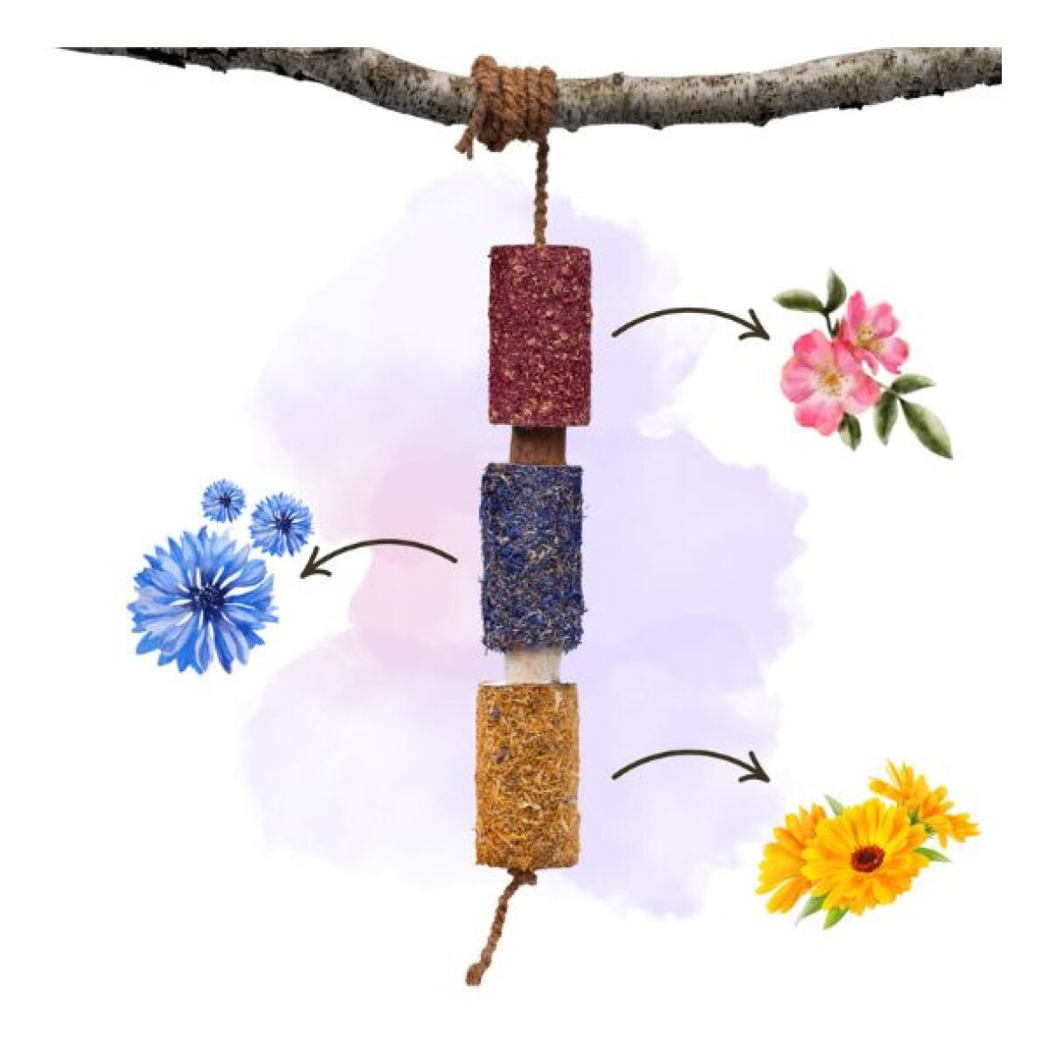 Ingredienser: Birkebark, fyrrebark, kornblomst, hybenblomster, morgenfrue, æteriske olier (lavendel, eucalyptus, pebermynte, citron), honning, kildevand, kokosfibersnor.